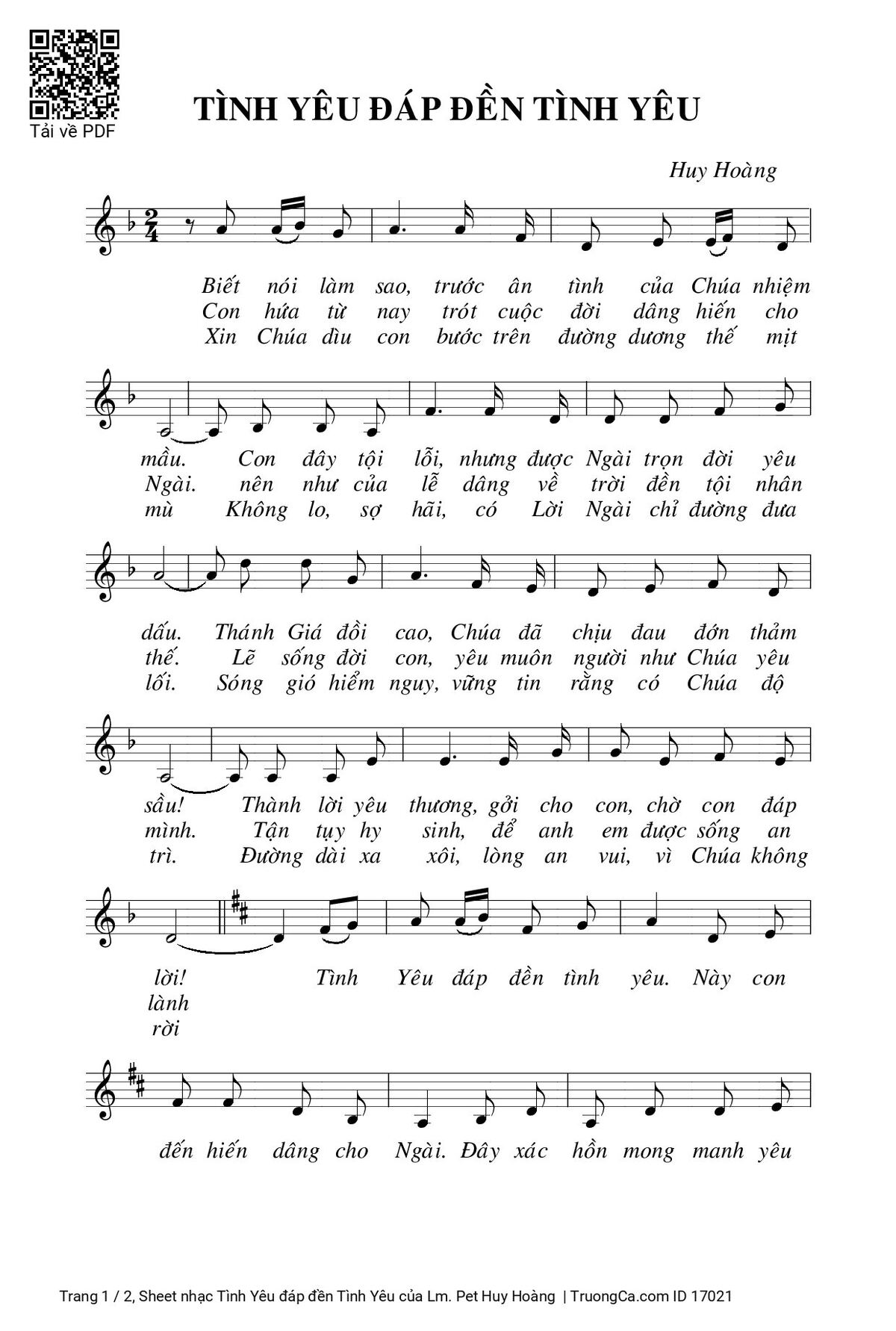 Sheet music Tình Yêu đáp đền Tình Yêu by Lm. Pet Huy Hoàng and PDF file was posted here to support you to practice singing perfectly. Sheets with notes and chords are for reference only, for non-commercial purposes only, not involved with earning money by buying and selling. Copyright is belong to song writer/author and copyright owner. Truongca.com do not own any copyrighted content. You can download the high-quality PDF files which contain staffs by PDF link above.