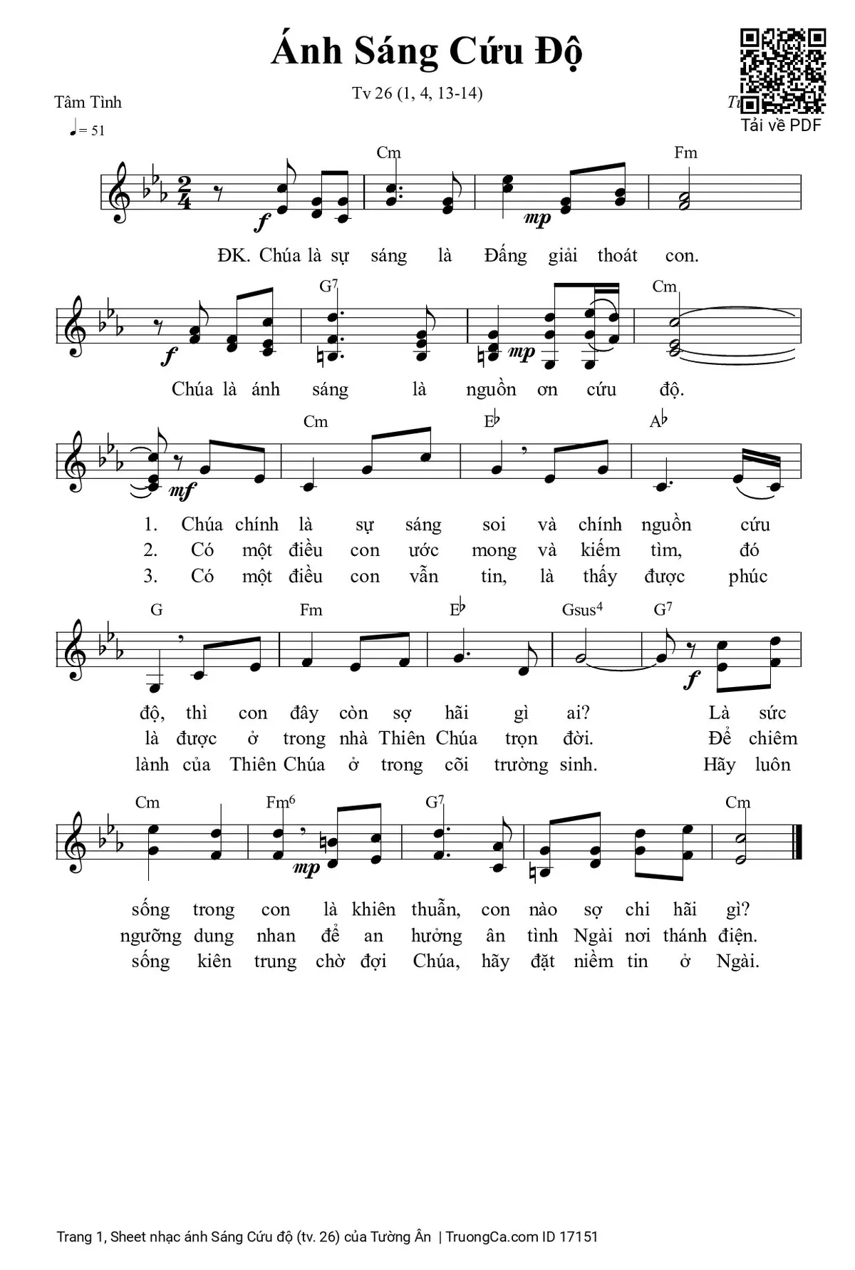 Điệp khúc. Chúa là sự sáng là Đấng giải thoát con. Chúa là ánh sáng là nguồn ơn cứu độ.