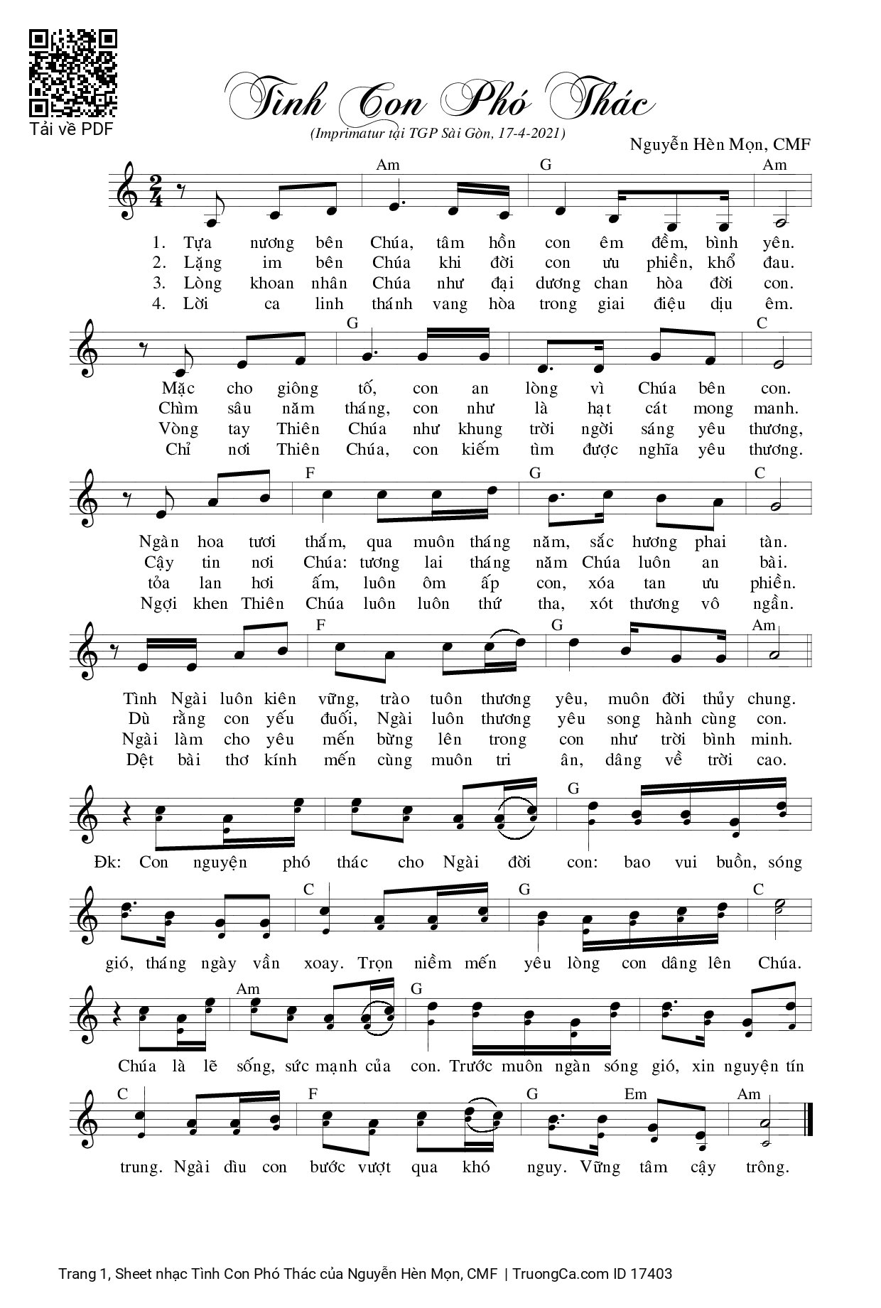 Điệp khúc: Con nguyện phó thác cho Ngài đời con, bao vui buồn sóng gió tháng ngày vần xoay. Trọn niềm mến yêu lòng con dâng lên Chúa. Chúa là lẽ sống sức mạnh của con, trước muôn ngàn sóng gió xin nguyện tín trung. Ngài dìu con bước vượt qua khó nguy vững tâm cậy trông.