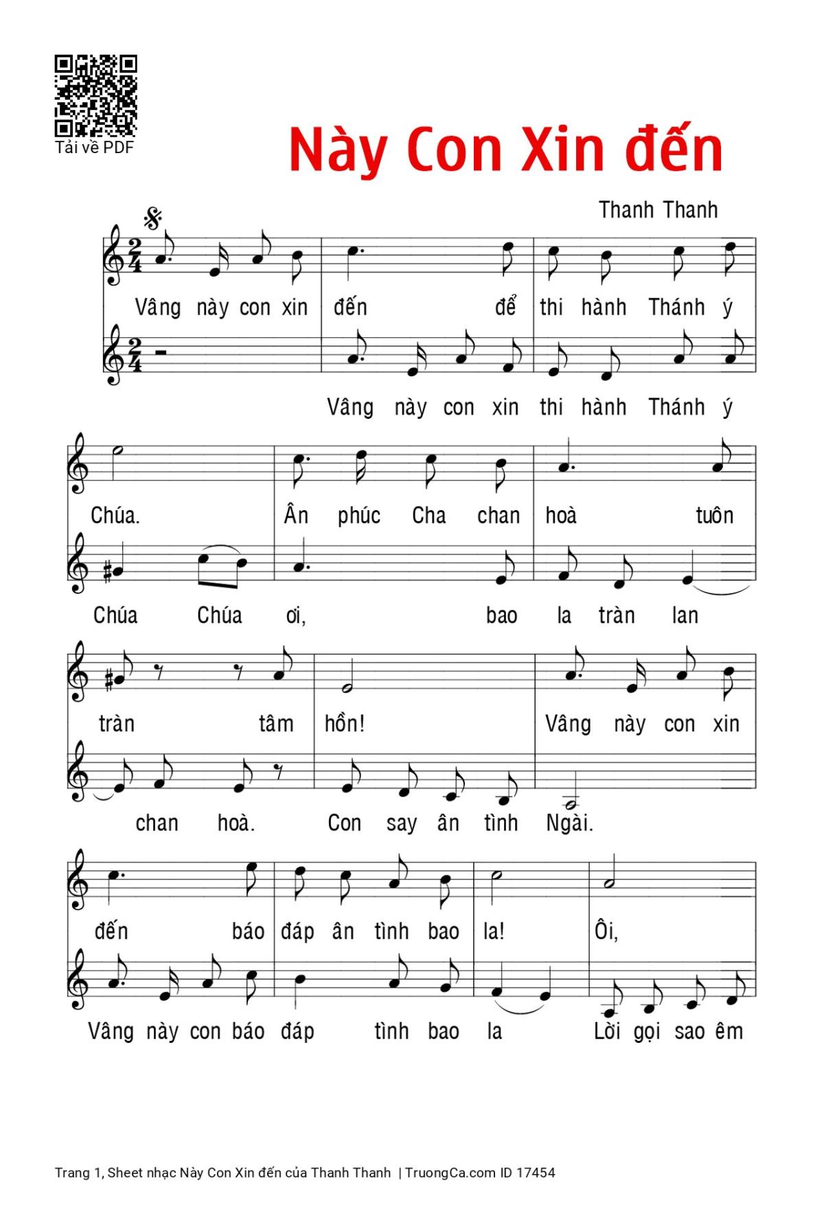 Điệp khúc. Này con xin đến để thi hành Thánh Ý Chúa. Ân phúc Cha chan hòa tuôn tràn tâm hồn! Vâng này con xin đến báo đáp ân tình bao la! Ôi, Lời Ngài thao thức thân con mỏi mòn.