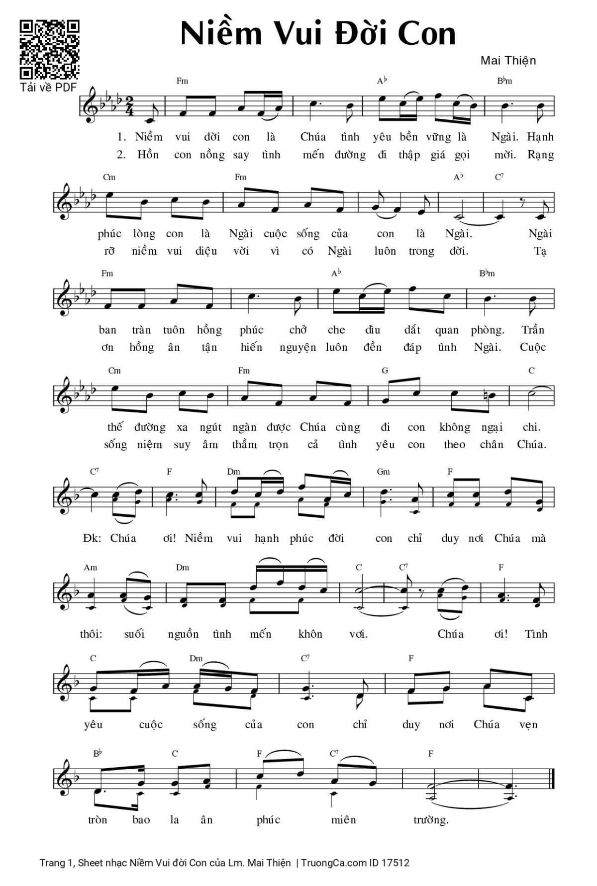Transposition is the process of moving a song's melody and chords up or down in pitch by a constant interval. The direction of the transposition tool is indicated by a plus (+) sign for up and a minus (-) sign for down. Hover mouse over chords signs to see the chords chart of Niềm Vui đời Con song.