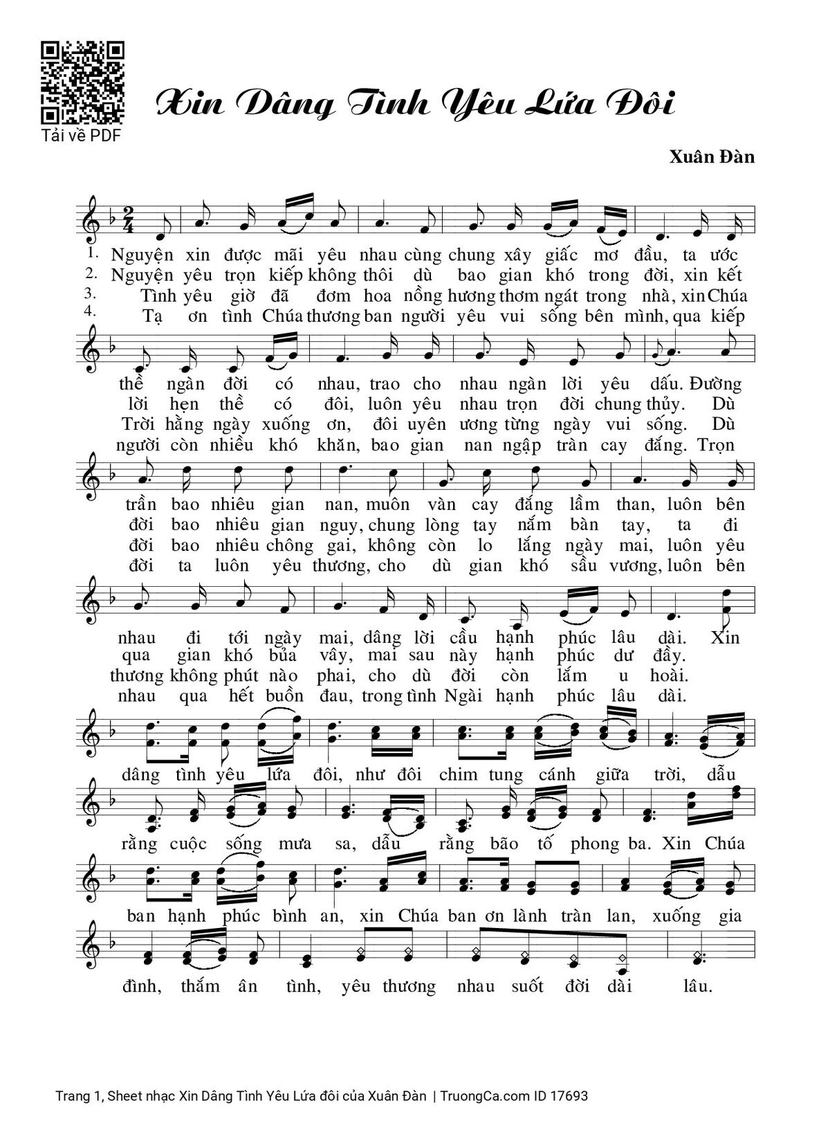 Điệp khúc: Xin dâng tình yêu lứa đôi, như đôi chim tung cánh giữa trời, dẫu rằng cuộc sống mưa sa, dẫu rằng bão tố phong ba, Xin Chúa ban hạnh phúc bình an, Xin Chúa ban ơn lành tràn lan, xuống gia đình, thắm ân tình yêu thương suốt đời dài lâu.