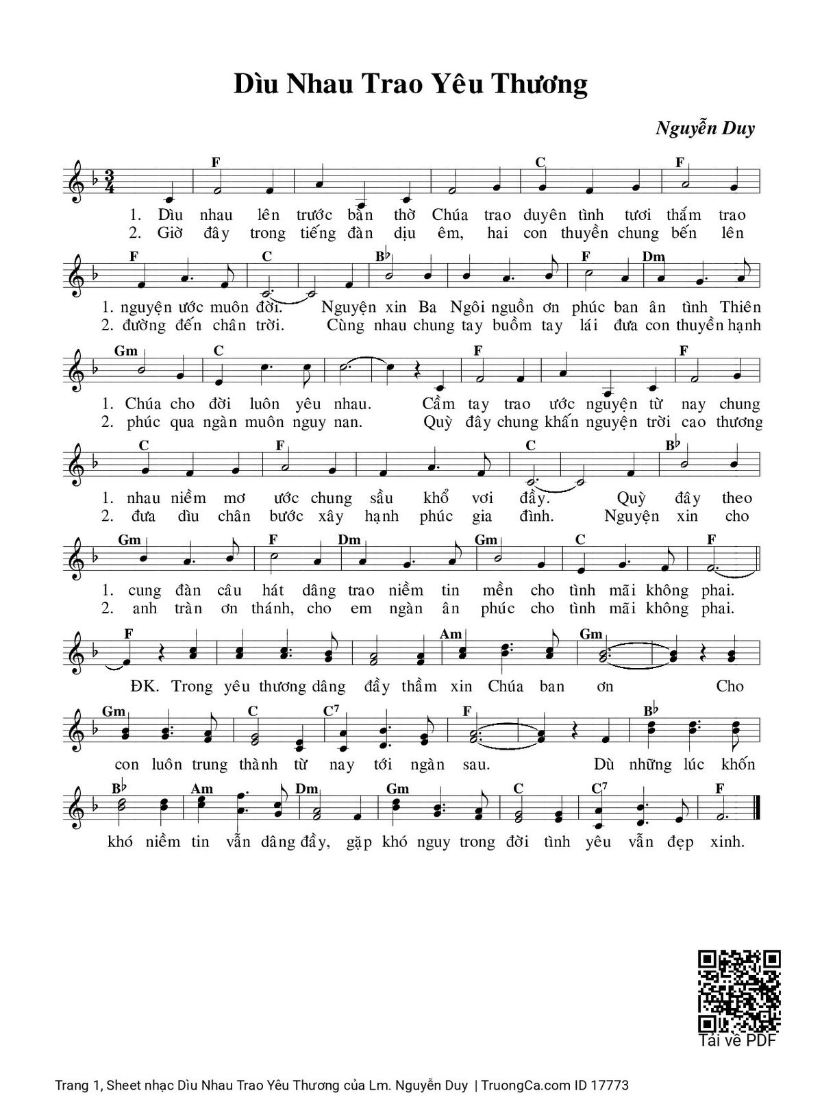 1. Dìu nhau lên trước bàn thờ Chúa trao duyên tình tươi thắm trao nguyện ước muôn đời. Nguyện xin Ba Ngôi nguồn ơn phúc ban ân tình Thiên Chúa cho đời luôn yêu nhau. Cầm tay trao ước nguyện từ nay, chung nhau niềm mơ ước, chung sầu khở vơi đầy. Quỳ đây theo cung đàn câu hát dâng trao niềm tin mến, cho tình mãi không phai.