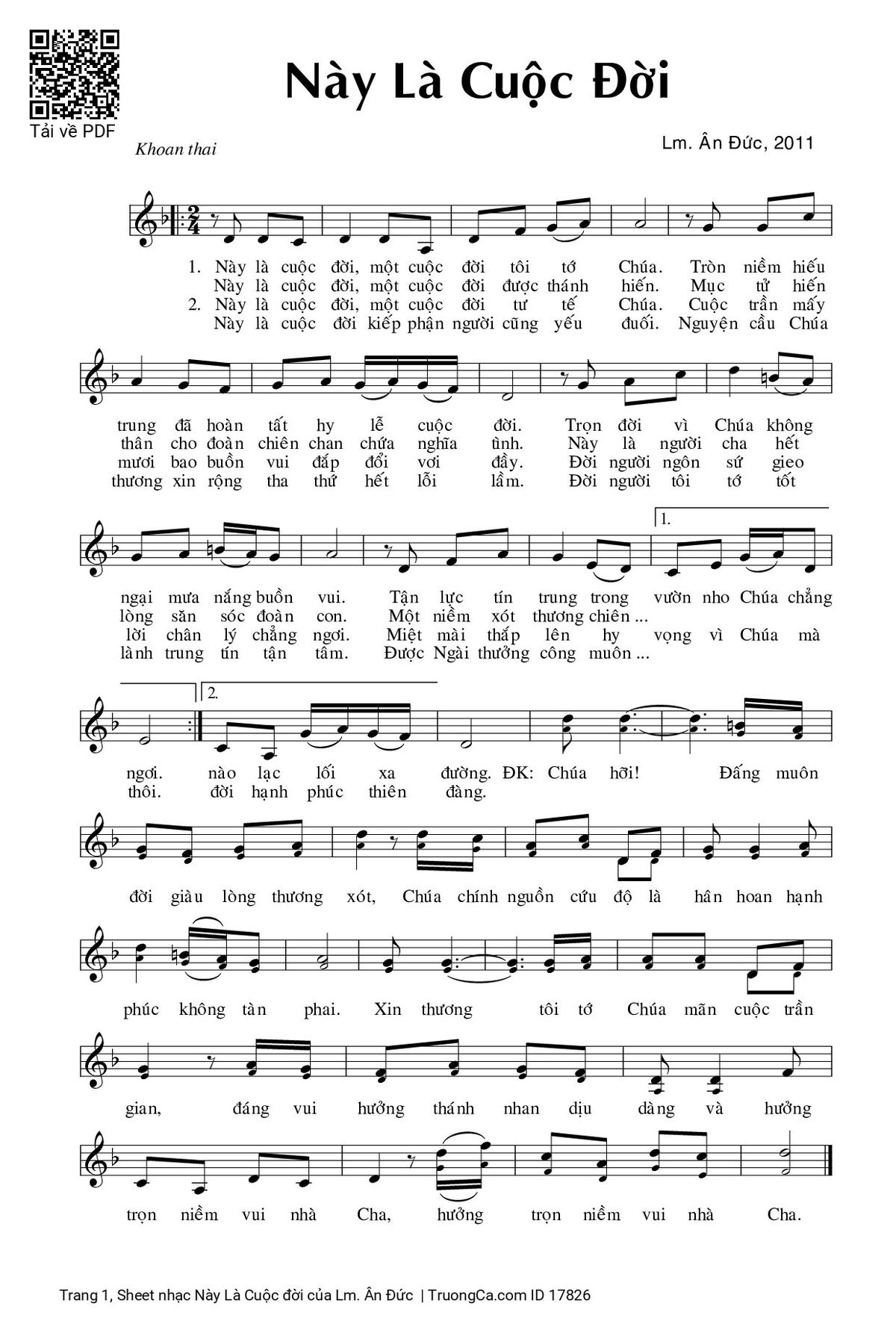 1/ Này là cuộc đời, một cuộc đời tôi tớ Chúa. Tròn niềm hiếu trung đã hoàn tất hy lễ cuộc đời. Trọn đời vì Chúa không ngại mưa nắng buồn vui. Tận lực tín trung trong vườn nho Chúa chẳng ngơi. Này là cuộc đời, một cuộc đời đước thánh hiến. Mục tử hiến thân cho đoàn chiên chan chứa nghĩa tình. Này là người cha hết lòng săn sóc đoàn con. Một niềm xót thương chiên nào lạc lối xa đường.