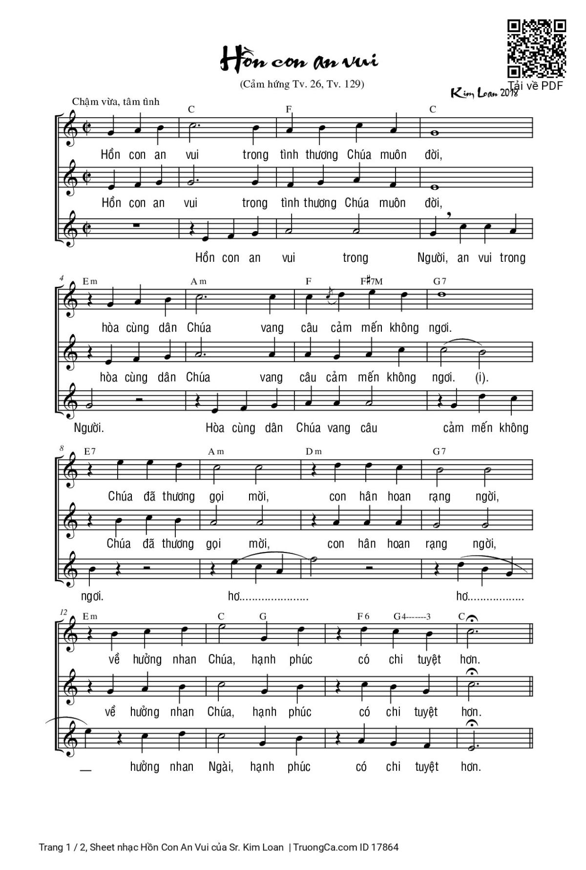 Điệp khúc. Hồn con an vui trong tình thương Chúa muôn đời, hòa cùng dân Chúa vang câu cảm mến không ngơi. Chúa đã thương gọi mời, con hân hoan rạng ngời về hưởng nhan Chúa hạnh phúc có chi tuyệt vời.
