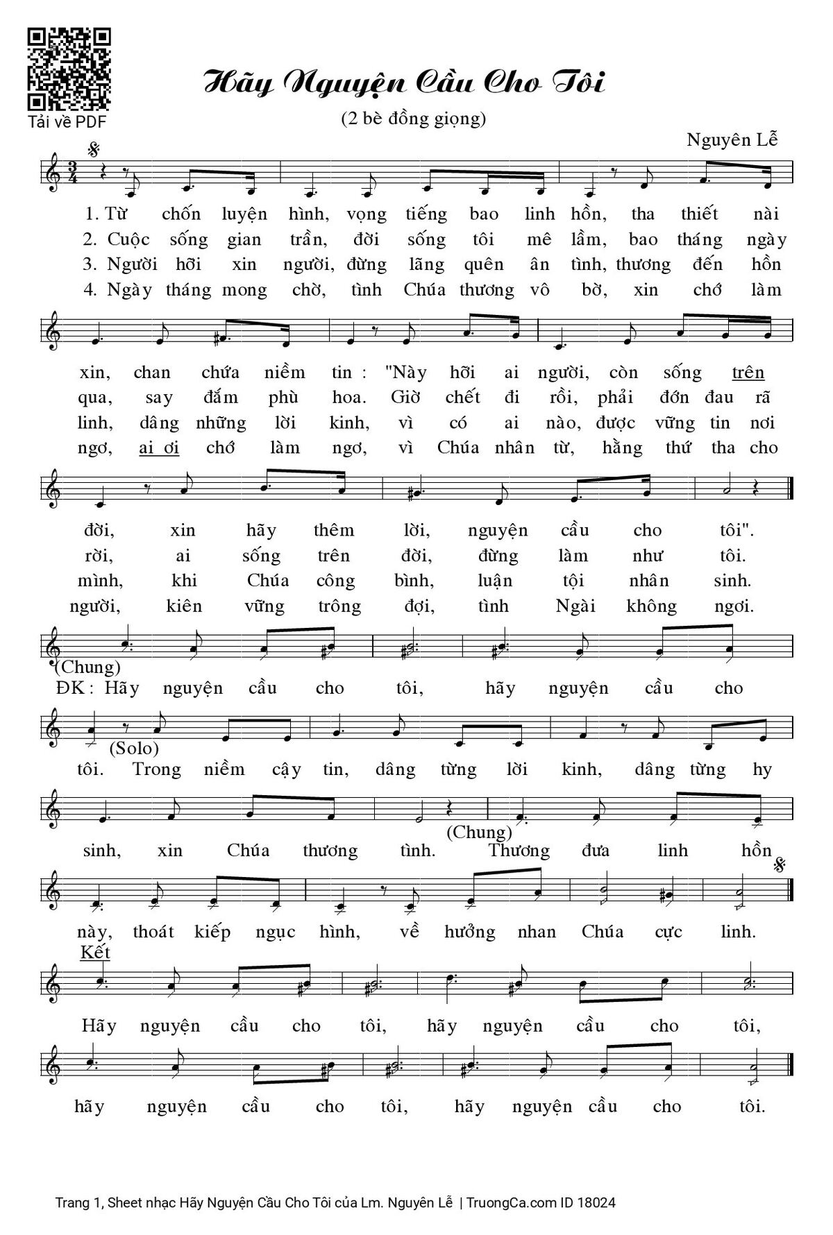 Điệp khúc. (Chung) Hãy nguyện cầu cho tôi, hãy nguyện cầu cho tôi. (Solo) Trong niềm cậy tin, dâng từng lời kinh, dâng từng hy sinh, xin Chúa thương tình. (Chung) Thương đưa linh hồn này, thoát kiếp ngục hình, về hưởng nhan Chúa cực linh.