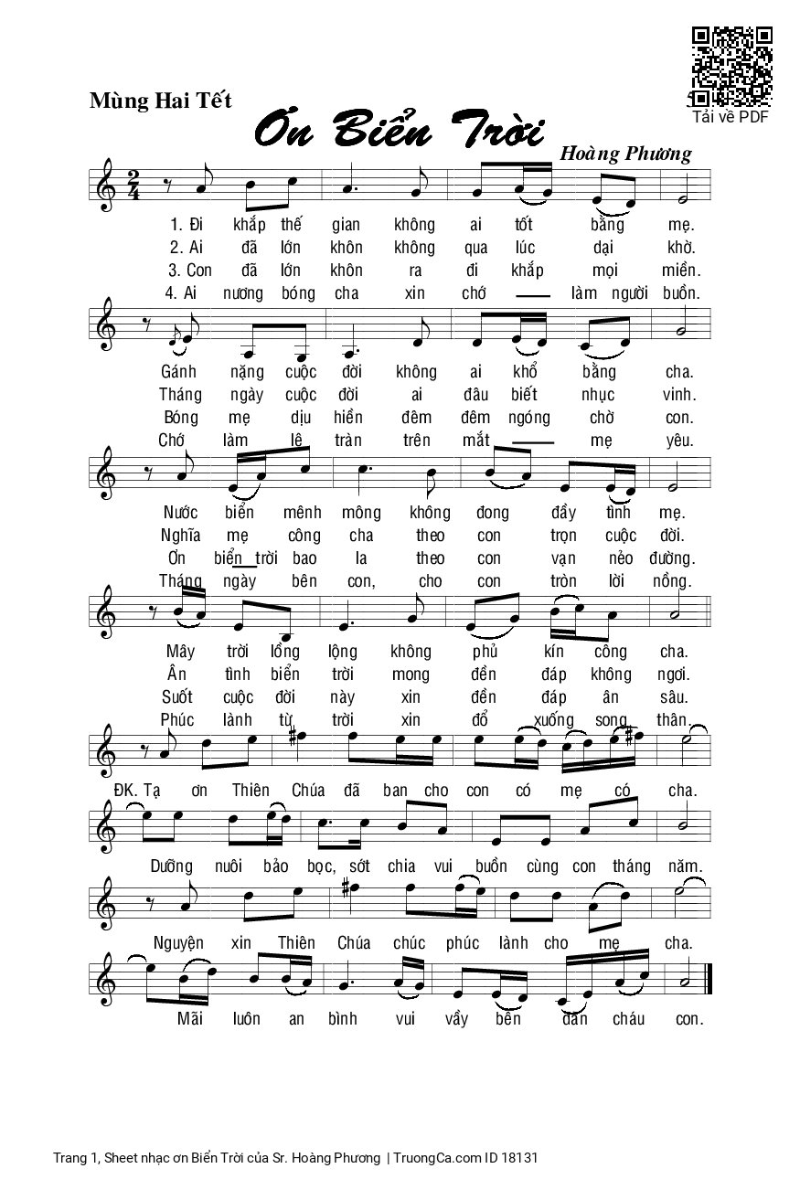 Điệp khúc. Tạ ơn Thiên Chúa đã ban cho con có Mẹ có Cha. Dưỡng nuôi bão bọc, sớt chia vui buồn cùng con tháng năm. Nguyện xin Thiên Chúa chúc phúc lành cho Mẹ Cha. Mãi luôn an bình vui vầy bên đàn cháu con.