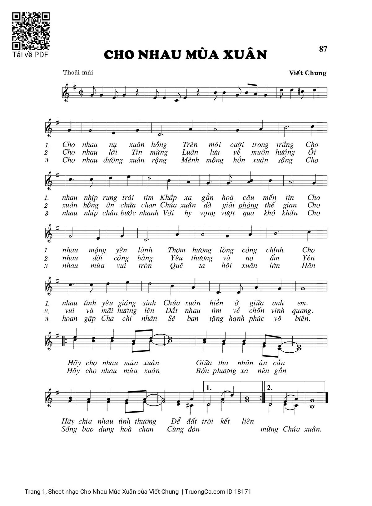 1. Cho nhau mùa xuân hồng. Trên môi cười trong trắng. Cho nhau nhịp rung trái tim. Khắp xa gần hòa câu mến tin. Cho nhau mộng yên lành. Thơm hương lòng công chính. Cho nhau tình yêu giáng sinh. Chúa xuân hiền ở giữa anh em.