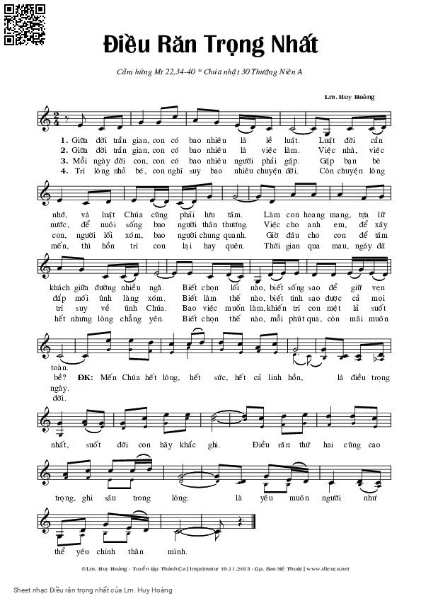 The Videos/audios Điều răn trọng nhất by Lm. Huy Hoàng were embed from Youtube, Musescore or the other 3rd links. Videos are subject to 3rd's copyright control and may be removed by YouTube's copyright rules and 3rd's policies or maybe included advertisements. If you cannot access to these songs, this mean that have been removed.