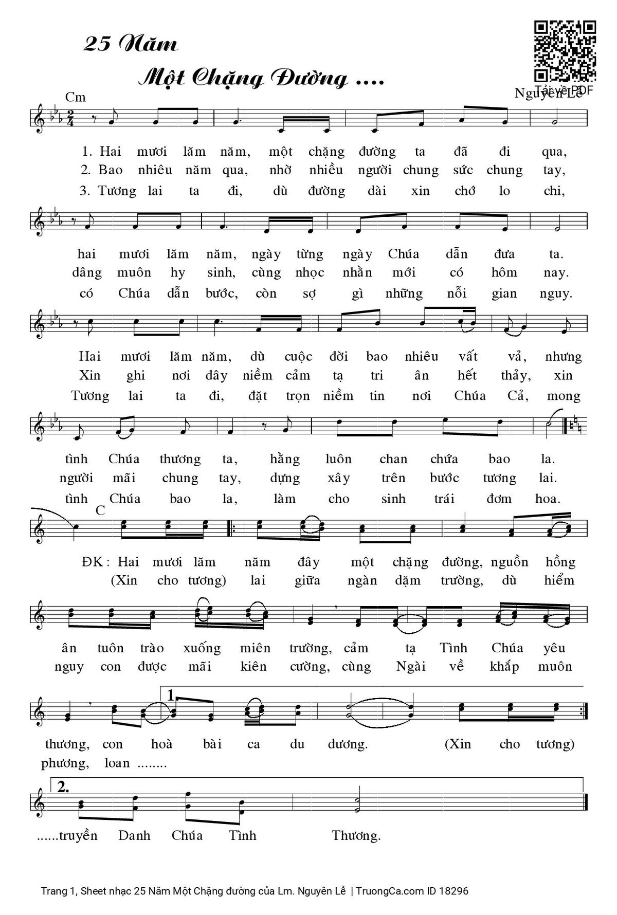 1/ Hai mươi lăm năm, một chặng đường ta đã đi qua. Hai mươi lăm năm,ngày từng ngày Chúa dẫn đưa ta. Hai mươi lăm năm,dù cuộc đời bao nhiêu vất vả, nhưng tình Chúa thương ta, hằng luôn chan chứa bao la.