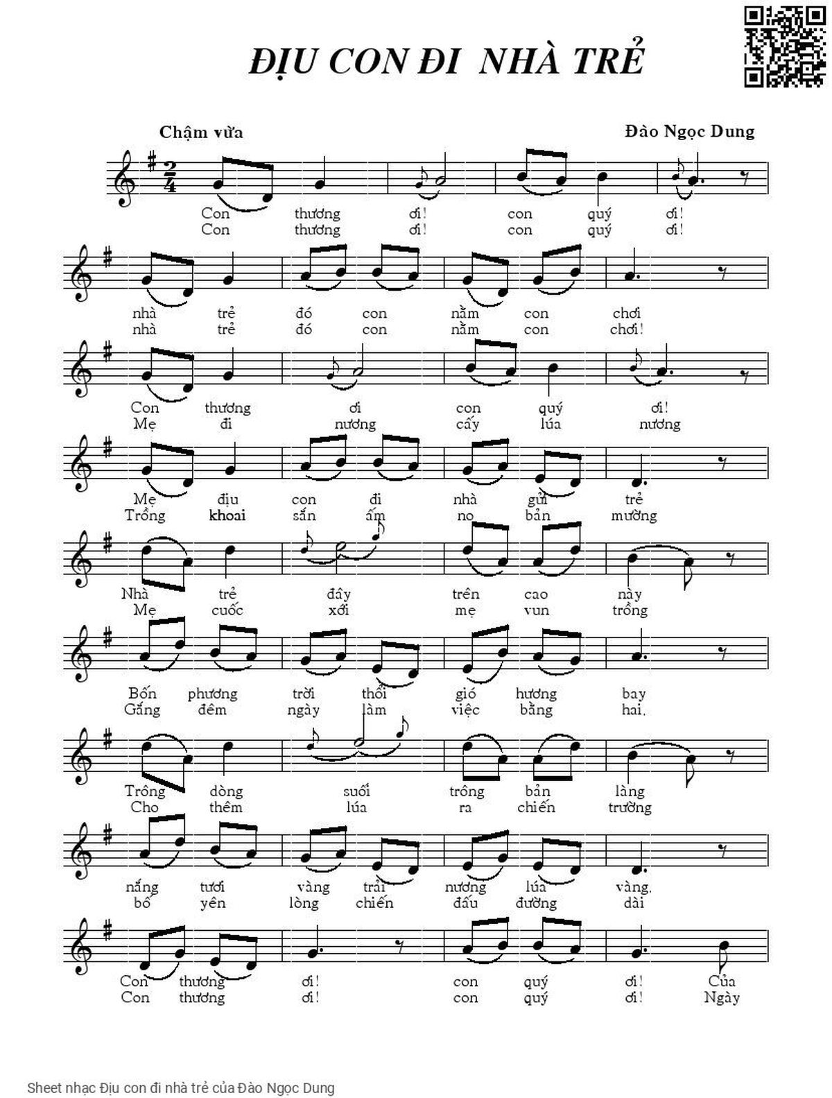 Transposition is the process of moving a song's melody and chords up or down in pitch by a constant interval. The direction of the transposition tool is indicated by a plus (+) sign for up and a minus (-) sign for down. Hover mouse over chords signs to see the chords chart of Địu con đi nhà trẻ song.