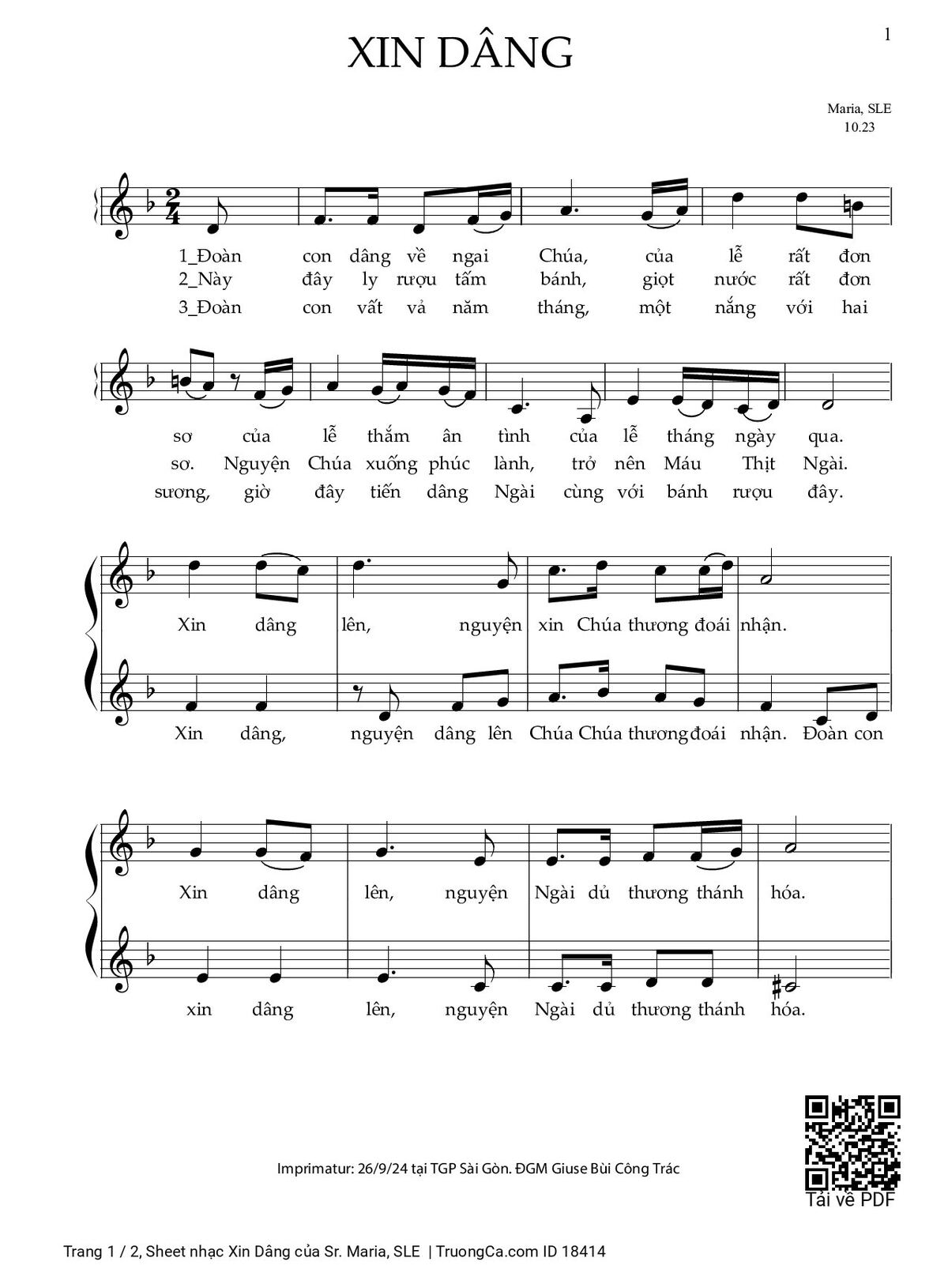 Điệp khúc. Xin dâng lên, nguyện xin Chúa thương đoái nhận. Xin dâng lên, nguyện Ngài dủ thương thánh hóa. Xin thương nhận lấy tấm lòng đoàn con hiệp dâng. Mong Ngài ban ơn biến đổi của lễ dâng tình yêu.