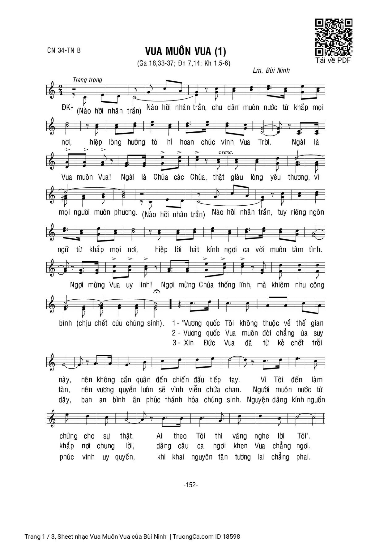Điệp khúc. Nào hỡi nhân trần, chư dân muôn nước từ khắp mọi nơi, hiệp lòng hướng tới hỉ hoan chúc vinh Vua Trời. Ngài là Vua muôn Vua! Ngài là Chúa các Chúa, thật giàu lòng yêu thương, vì mọi người muôn phương.