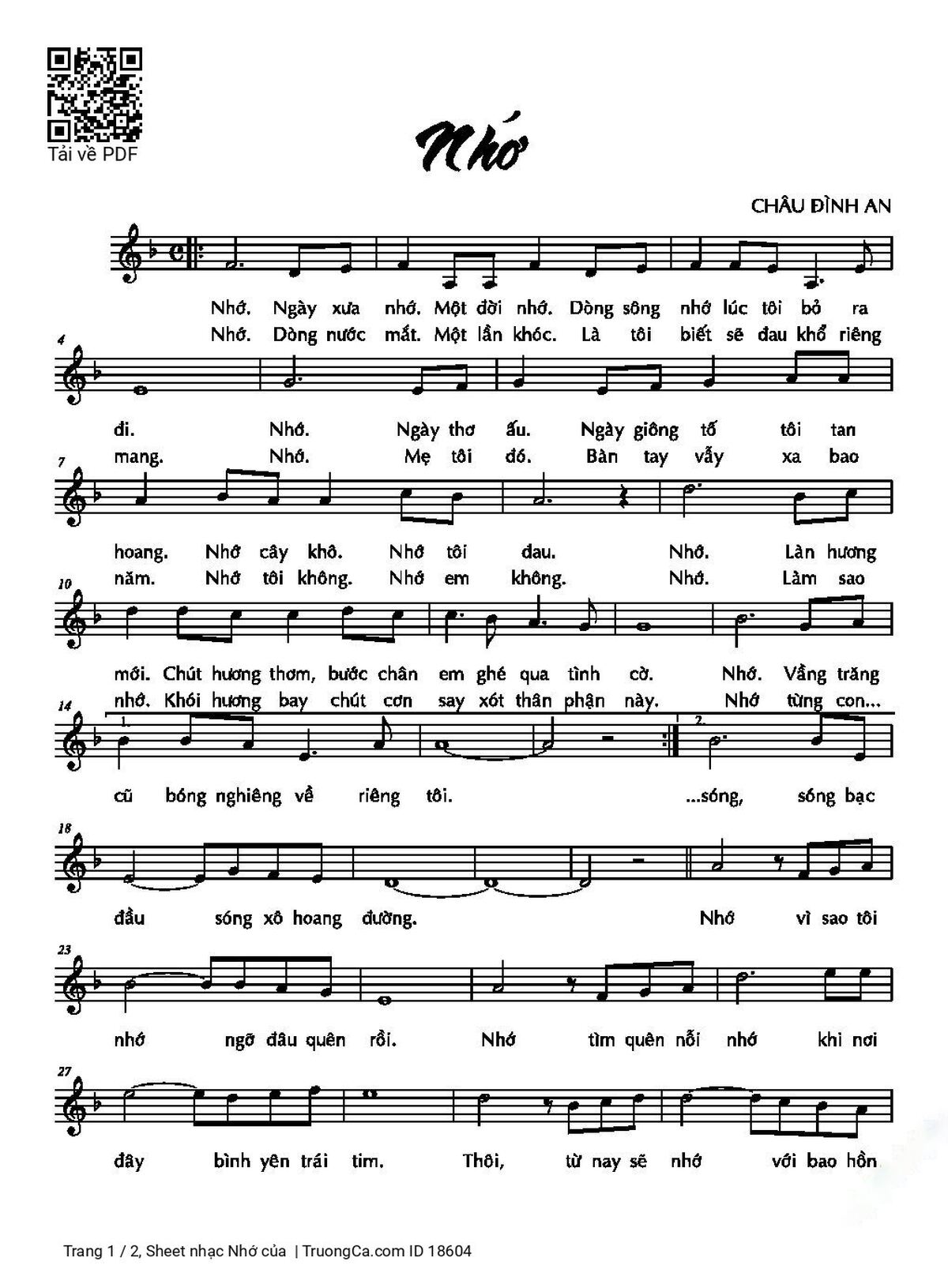Page 1 of Sheet music PDF Nhớ -