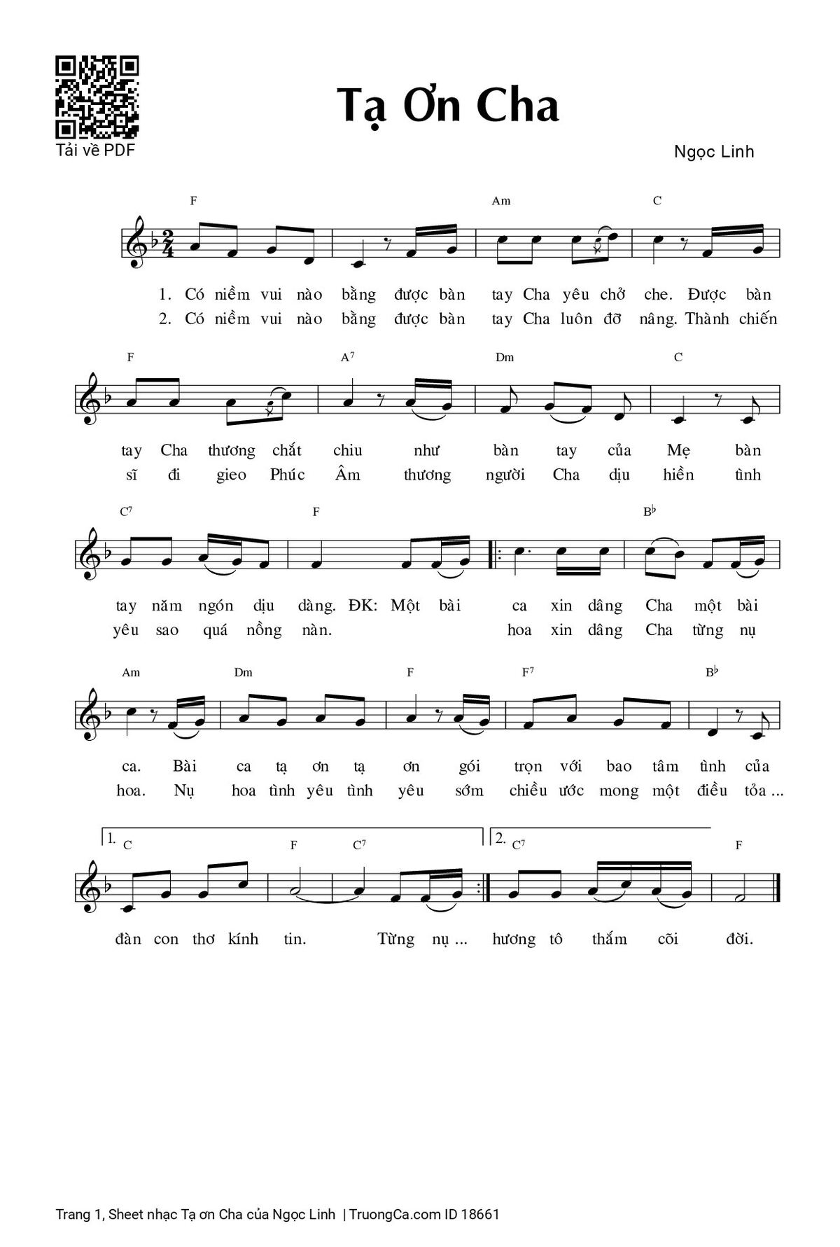 Điệp khúc. Một bài ca xin dâng Cha một bài ca. Bài ca tạ ơn, tạ ơn gói trọn với bao tâm tình của đàn con thơ kính tin. Từng nụ hoa xin dâng Cha, từng nụ hoa. Nụ hoa tình yêu tình yêu sớm chiều ước mong một điều tỏa hương tô thắm cõi đời.