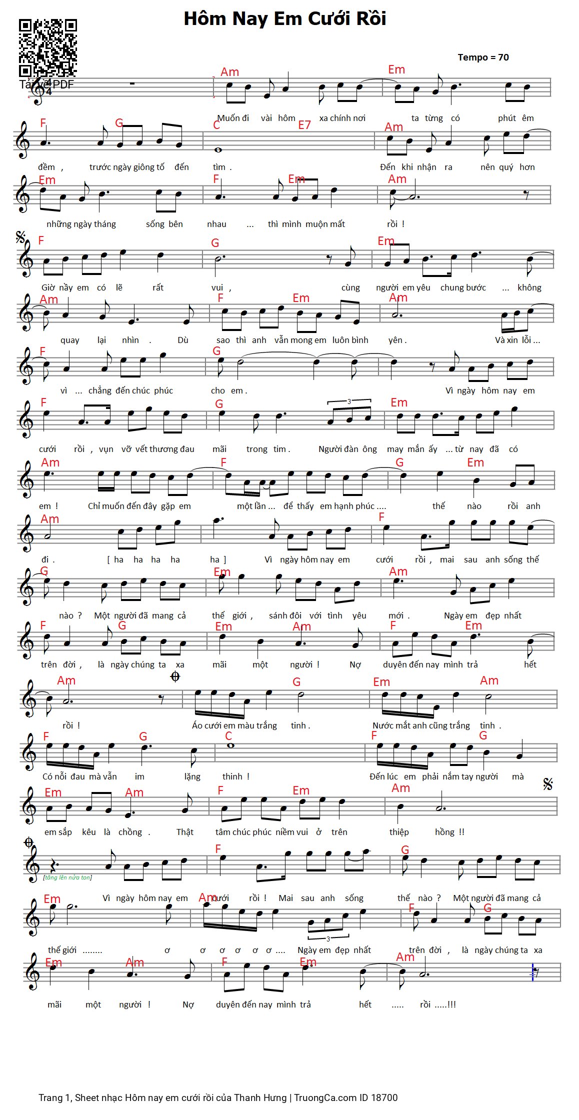 Transposition is the process of moving a song's melody and chords up or down in pitch by a constant interval. The direction of the transposition tool is indicated by a plus (+) sign for up and a minus (-) sign for down. Hover mouse over chords signs to see the chords chart of Hôm nay em cưới rồi song.