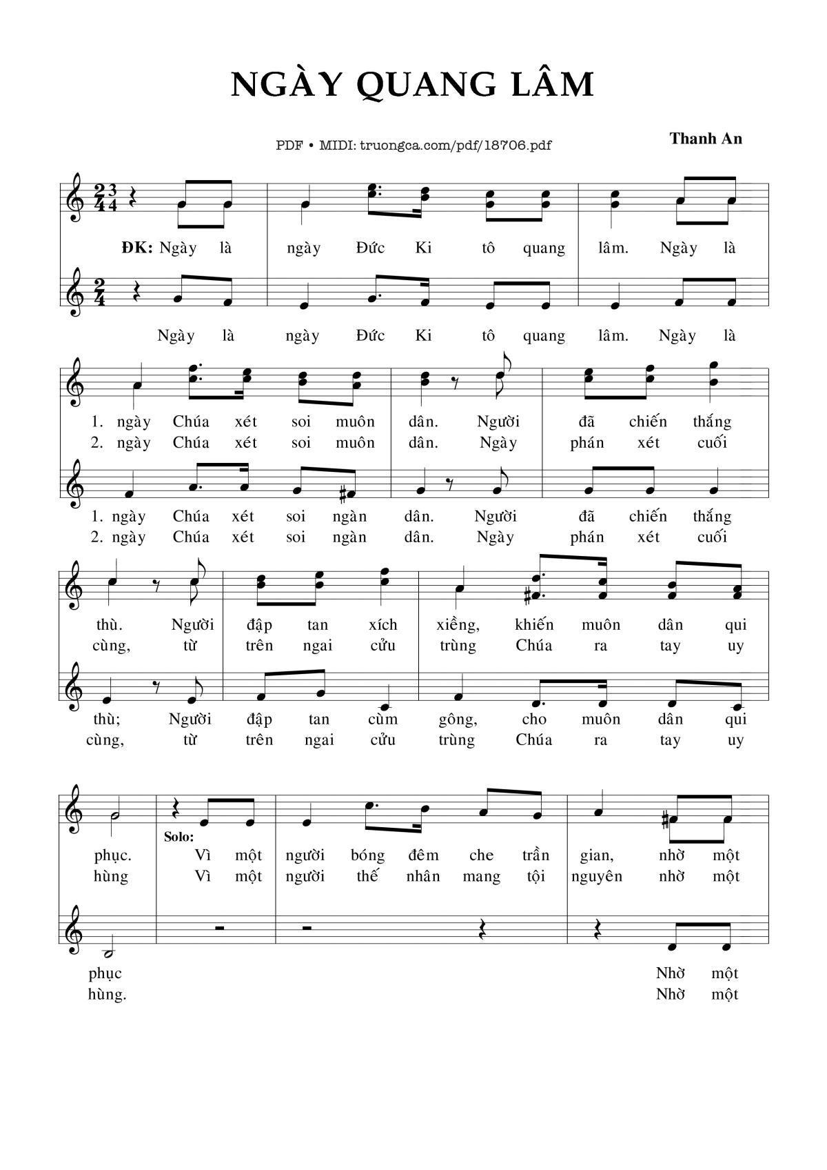 Điệp khúc 1: Ngày là ngày Đức Ki-tô quang lâm. Ngày là ngày Chúa xét soi muôn dân. Người đã chiến thắng thù. Người đập tan xích xiềng, khiến muôn dân qui phục. Vì một người bóng đêm che trần gian, nhờ một người ánh sáng nay toả lan, nhờ chính Đức Ki-tô và trong Đức Ki-tô Vua muôn vua.
