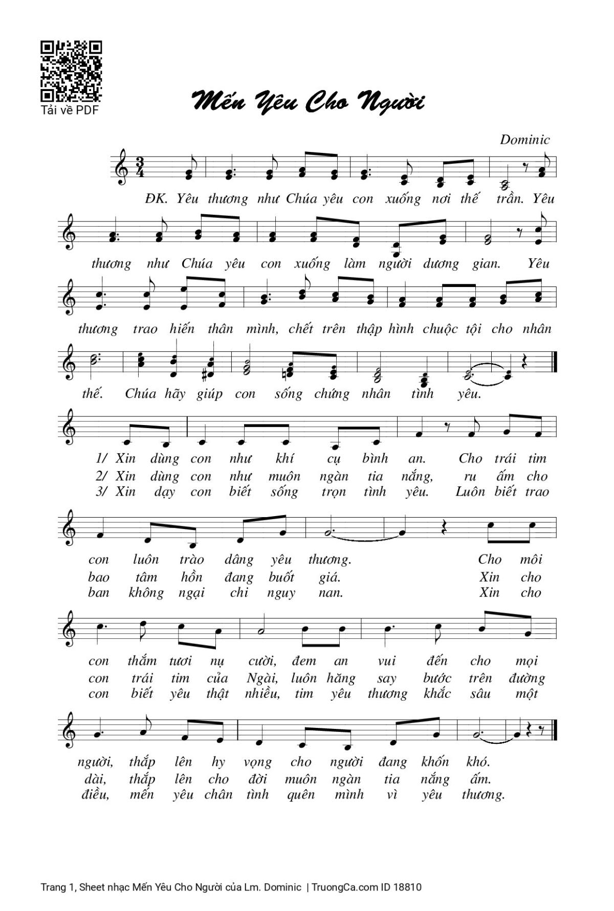 Điệp khúc. Yêu thương như Chúa yêu con xuống nơi thế trần. Yêu thương như Chúa yêu con xuống làm Người dương gian. Yêu thương trao hiến thân mình, chết trên thập hình chuộc tội cho nhân thế. Chúa hãy giúp con sống chứng nhân tình yêu.