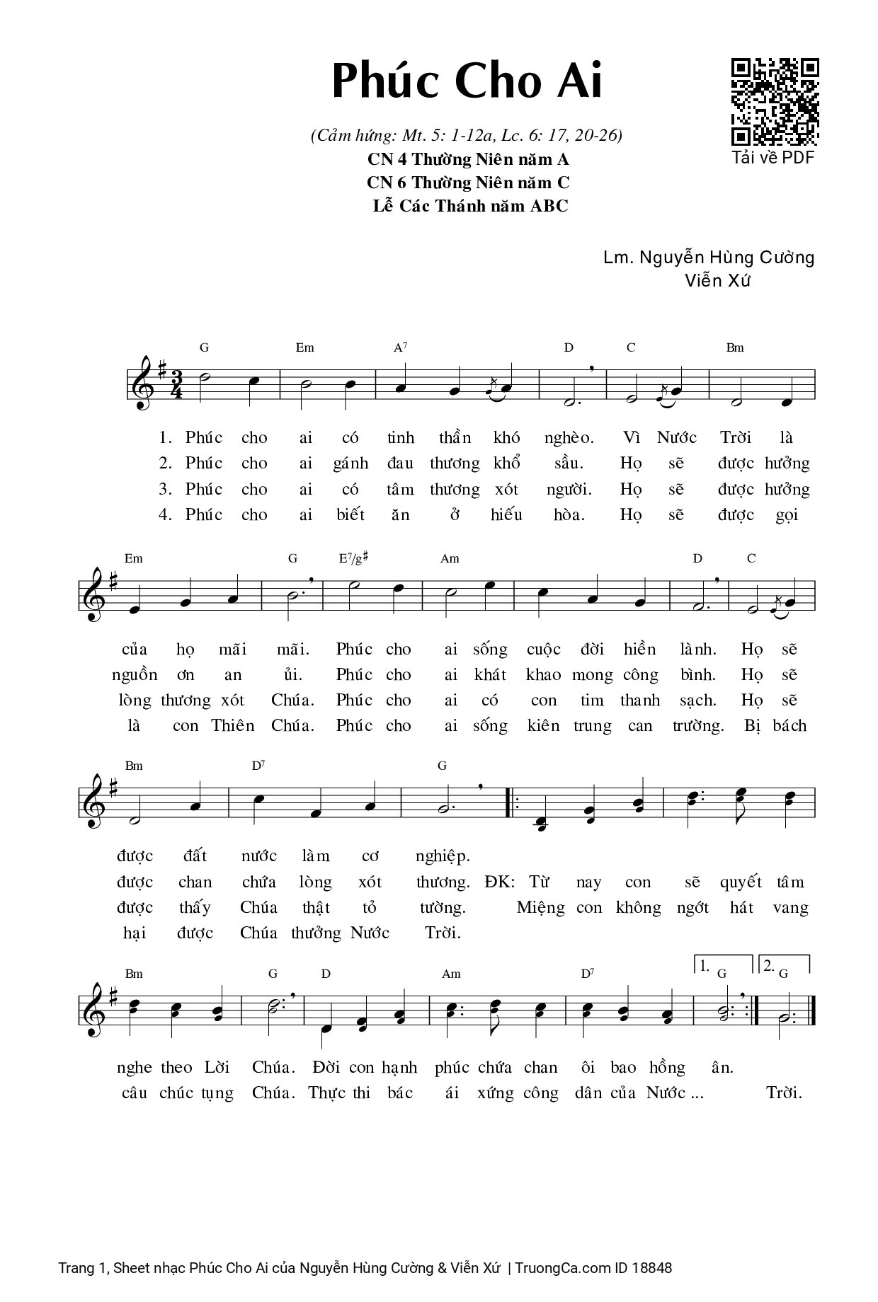 1. Phúc cho ai có tinh thần khó nghèo. Vì Nước Trời là của họ mãi mãi. Phúc cho ai sống cuộc đời hiền lành. Họ sẽ được đất nước làm cơ nghiệp.