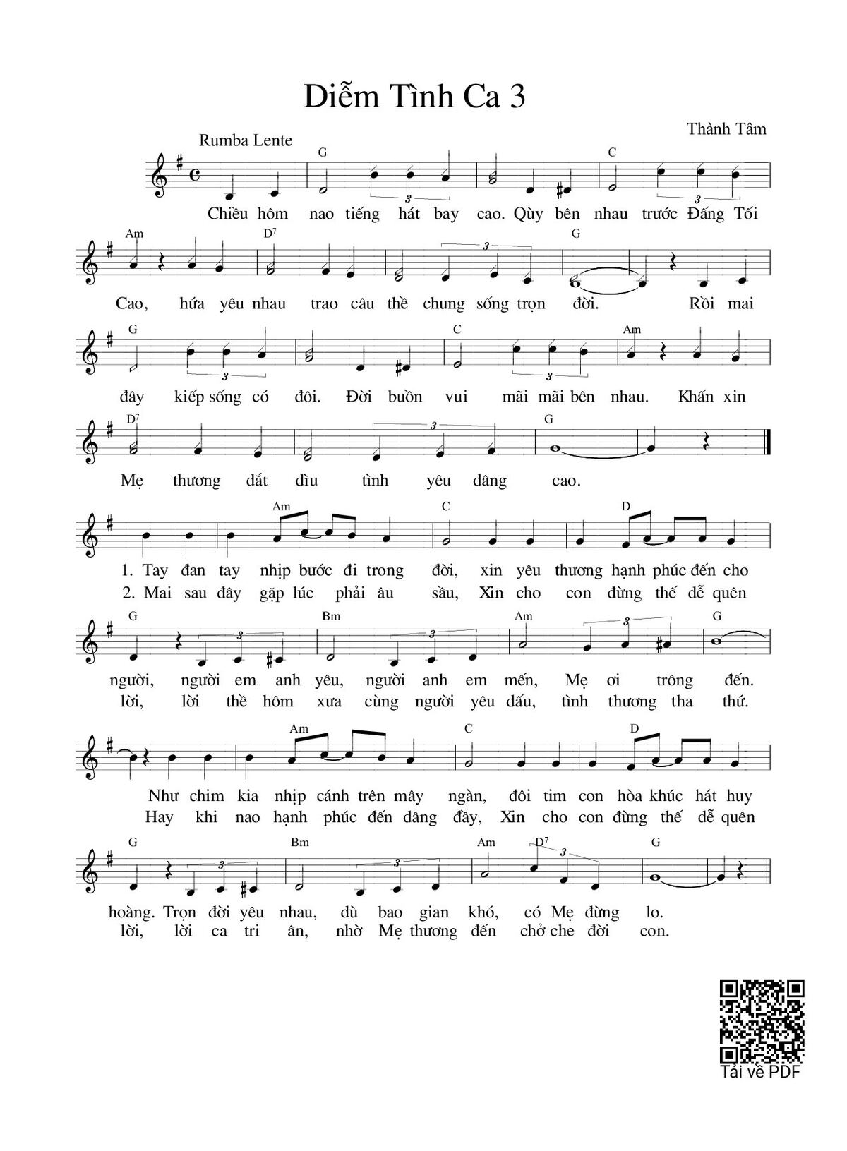 Transposition is the process of moving a song's melody and chords up or down in pitch by a constant interval. The direction of the transposition tool is indicated by a plus (+) sign for up and a minus (-) sign for down. Hover mouse over chords signs to see the chords chart of Diễm tình ca 3 song.