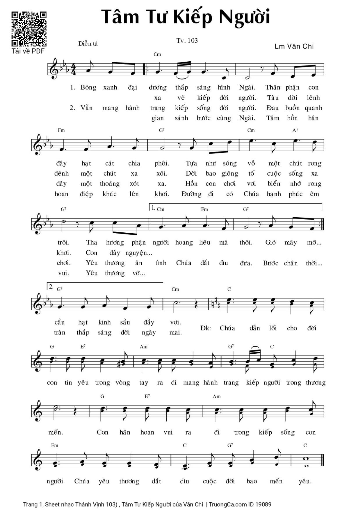 The Videos/audios Thánh Vịnh 103) , Tâm Tư Kiếp Người by Văn Chi were embed from Youtube, Musescore or the other 3rd links. Videos are subject to 3rd's copyright control and may be removed by YouTube's copyright rules and 3rd's policies or maybe included advertisements. If you cannot access to these songs, this mean that have been removed.