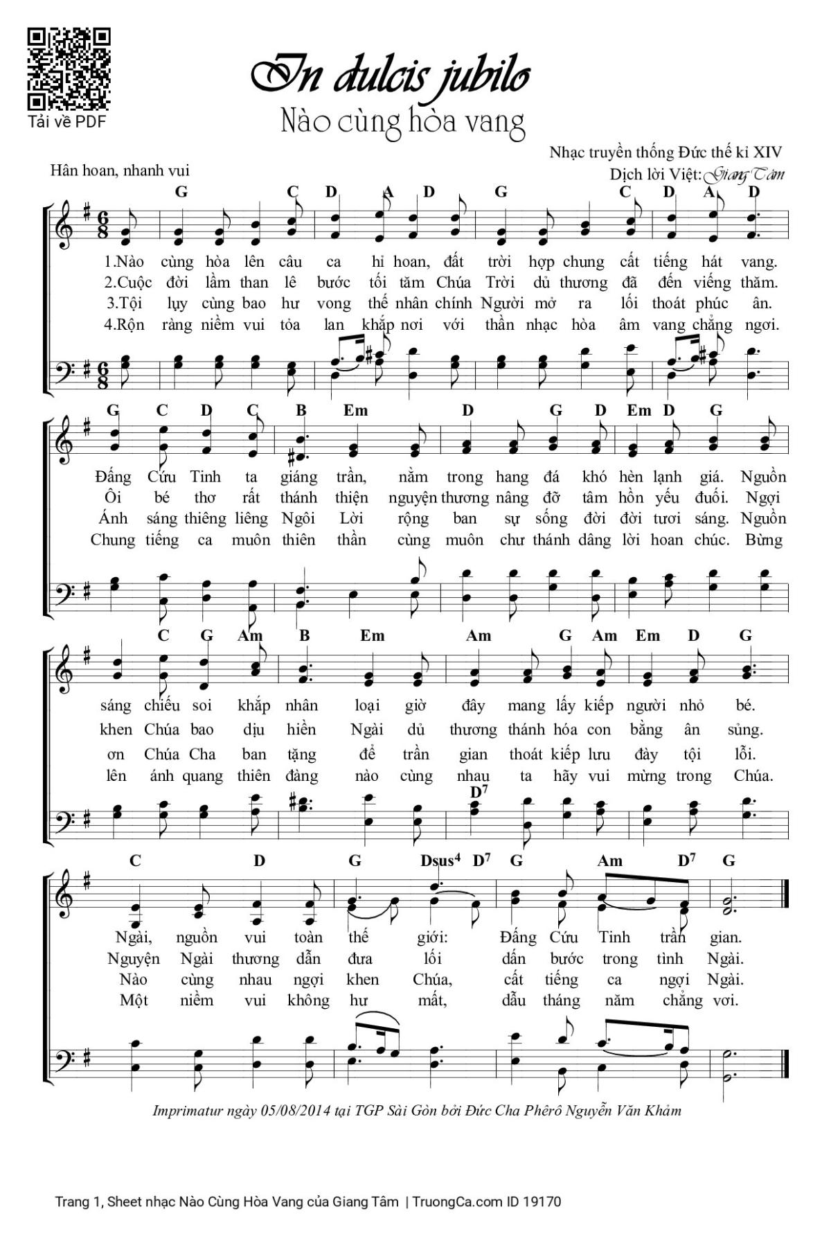 Transposition is the process of moving a song's melody and chords up or down in pitch by a constant interval. The direction of the transposition tool is indicated by a plus (+) sign for up and a minus (-) sign for down. Hover mouse over chords signs to see the chords chart of Nào Cùng Hòa Vang song.