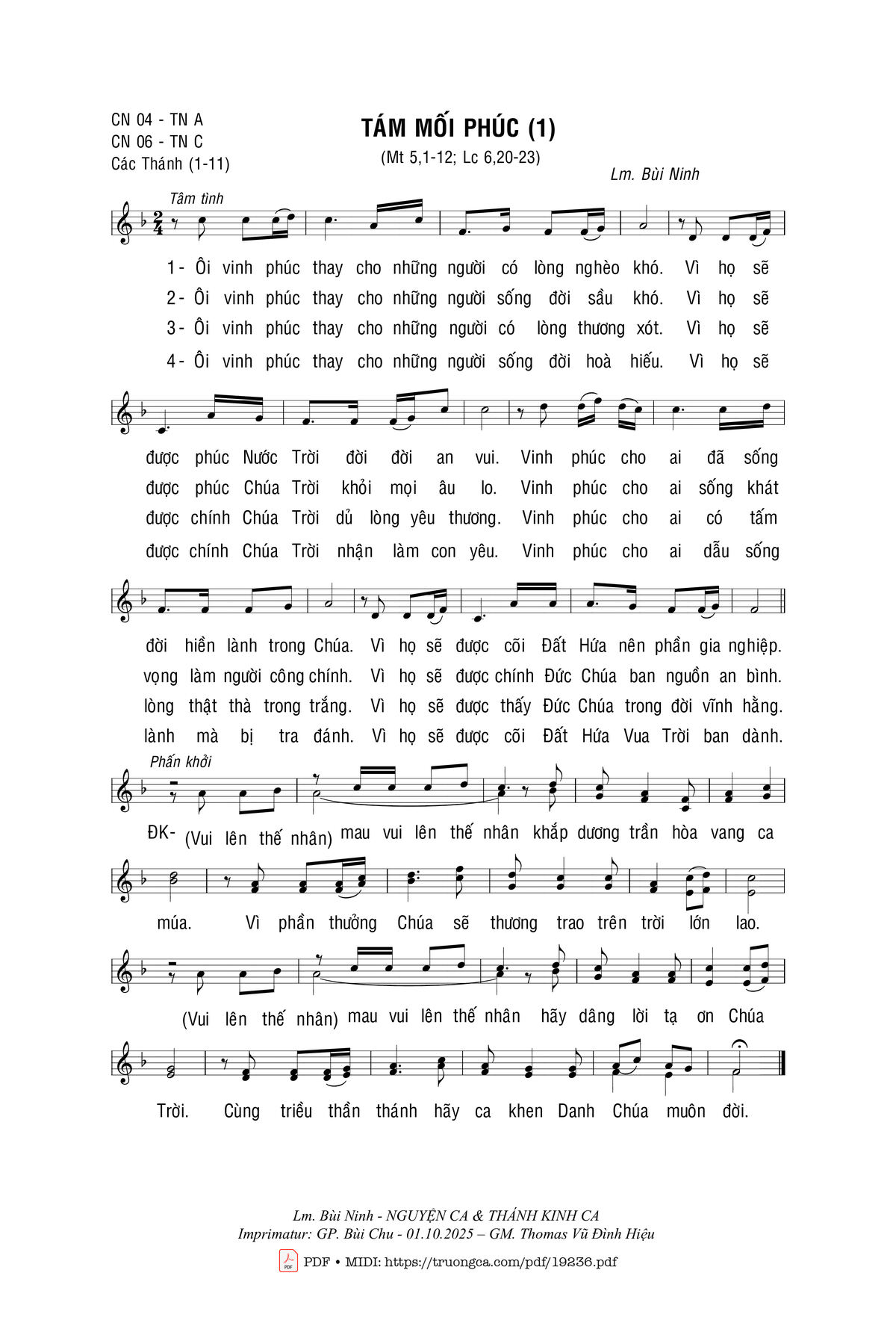 1. Ôi vinh phúc thay cho những người có lòng nghèo khó. Vì họ sẽ được phúc Nước Trời đời đời an vui. Vinh phúc cho ai đã sống đời hiền lành trong Chúa. Vì họ sẽ được cõi Đất Hứa nên phần gia nghiệp.