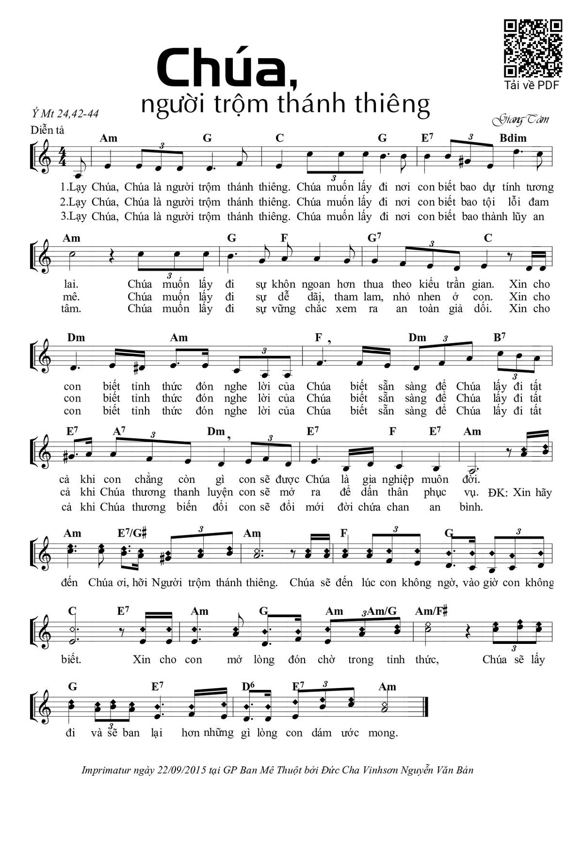 3. Lạy Chúa, Chúa là người trộm thánh thiêng. Chúa muốn lấy đi nơi con biết bao thành lũy an tâm. Chúa muốn lấy đi sự vững chắc xem ra an toàn giả dối. Xin cho con biết tỉnh thức đón nghe lời của Chúa biết sẵn sàng để Chúa lấy đi tất cả khi Chúa thương biến đổi con sẽ đổi mới đời chứa chan an bình.