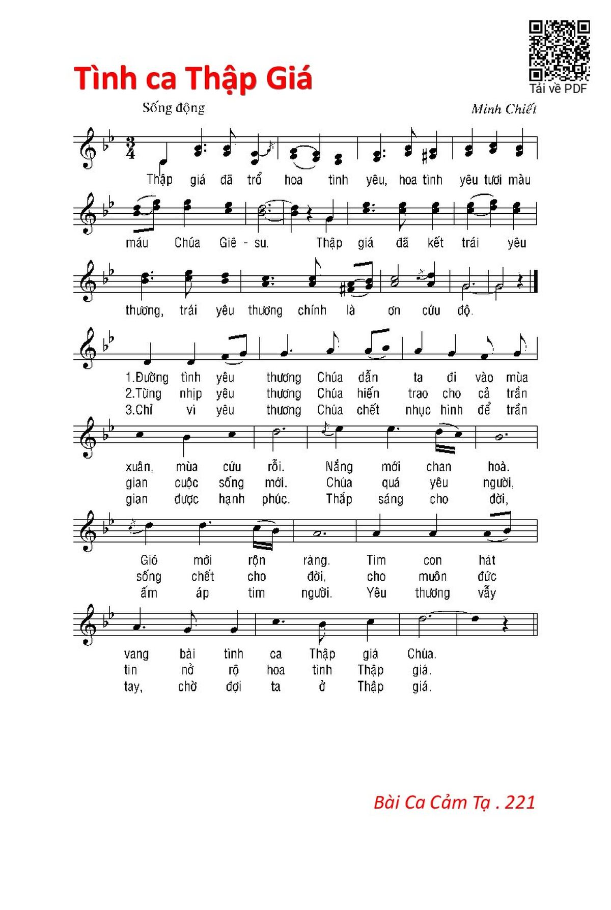 Điệp khúc: Thập giá đã trổ hoa tình yêu, hoa tình yêu tươi màu máu Chúa Giê-su. Thập giá đã kết trái yêu thương, trái yêu thương chính là ơn cứu độ.