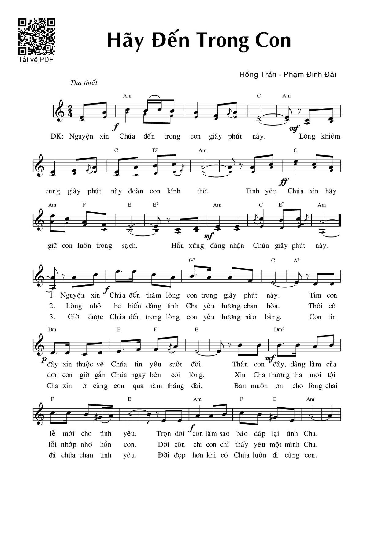 Sheet music Hãy đến trong con by Phạm Đình Đài and PDF file was posted here to support you to practice singing perfectly. Sheets with notes and chords are for reference only, for non-commercial purposes only, not involved with earning money by buying and selling. Copyright is belong to song writer/author and copyright owner. Truongca.com do not own any copyrighted content. You can download the high-quality PDF files which contain staffs by PDF link above.