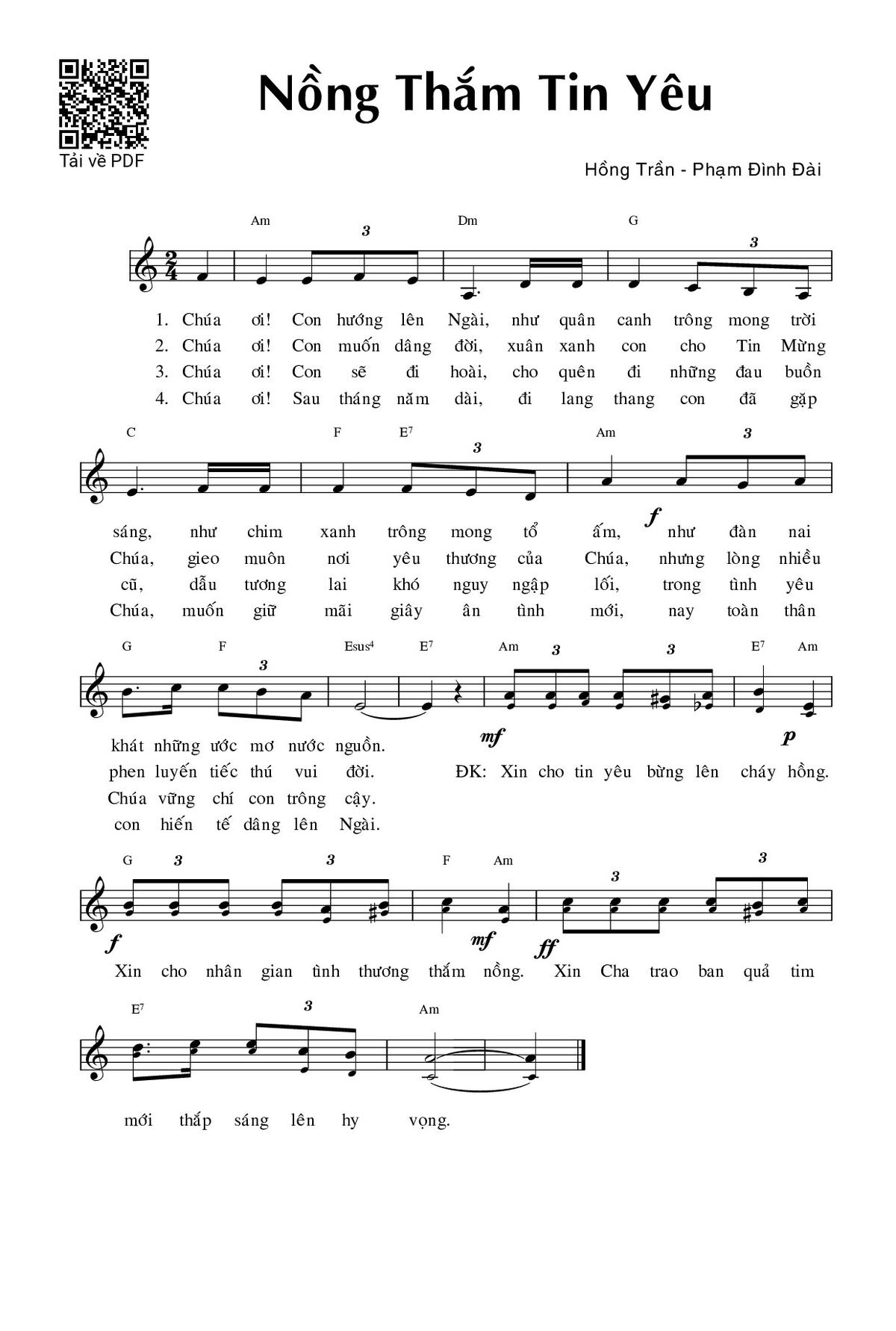 Transposition is the process of moving a song's melody and chords up or down in pitch by a constant interval. The direction of the transposition tool is indicated by a plus (+) sign for up and a minus (-) sign for down. Hover mouse over chords signs to see the chords chart of Nồng thắm tin yêu song.