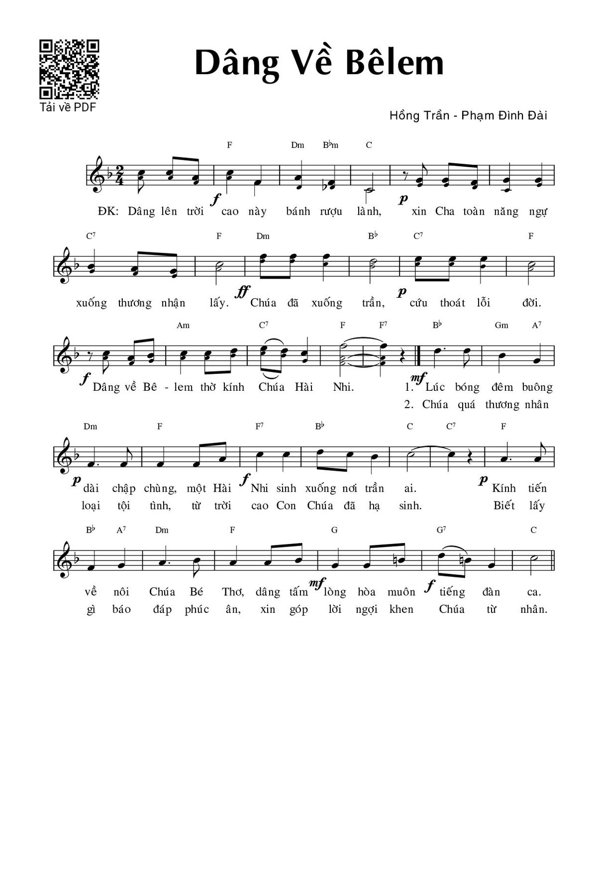 Sheet music Dâng về Bêlem by Phạm Đình Đài and PDF file was posted here to support you to practice singing perfectly. Sheets with notes and chords are for reference only, for non-commercial purposes only, not involved with earning money by buying and selling. Copyright is belong to song writer/author and copyright owner. Truongca.com do not own any copyrighted content. You can download the high-quality PDF files which contain staffs by PDF link above.