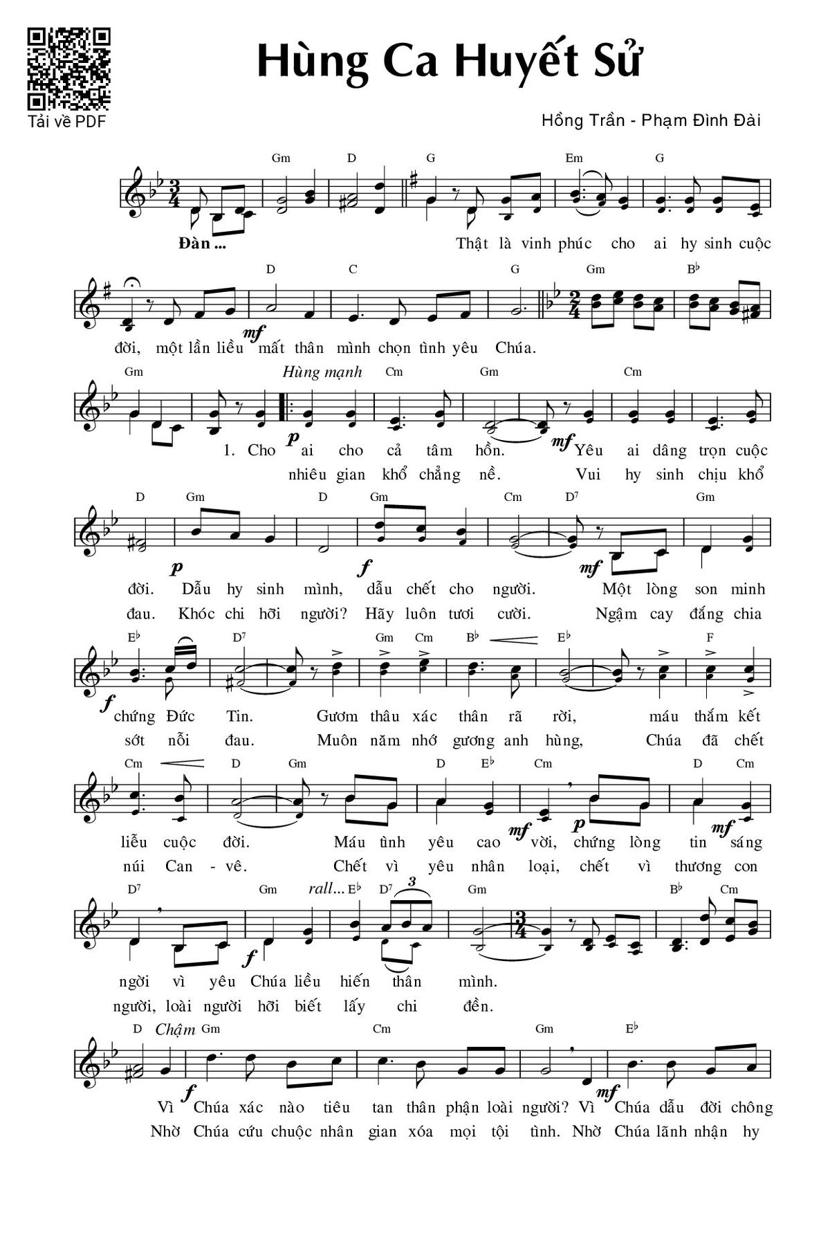 Transposition is the process of moving a song's melody and chords up or down in pitch by a constant interval. The direction of the transposition tool is indicated by a plus (+) sign for up and a minus (-) sign for down. Hover mouse over chords signs to see the chords chart of Hùng ca huyết sử song.