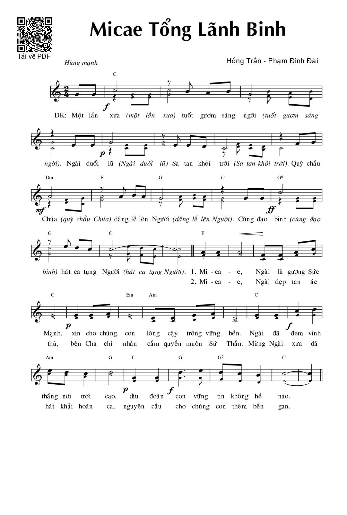 Sheet music Micae Tổng lãnh binh by Phạm Đình Đài and PDF file was posted here to support you to practice singing perfectly. Sheets with notes and chords are for reference only, for non-commercial purposes only, not involved with earning money by buying and selling. Copyright is belong to song writer/author and copyright owner. Truongca.com do not own any copyrighted content. You can download the high-quality PDF files which contain staffs by PDF link above.