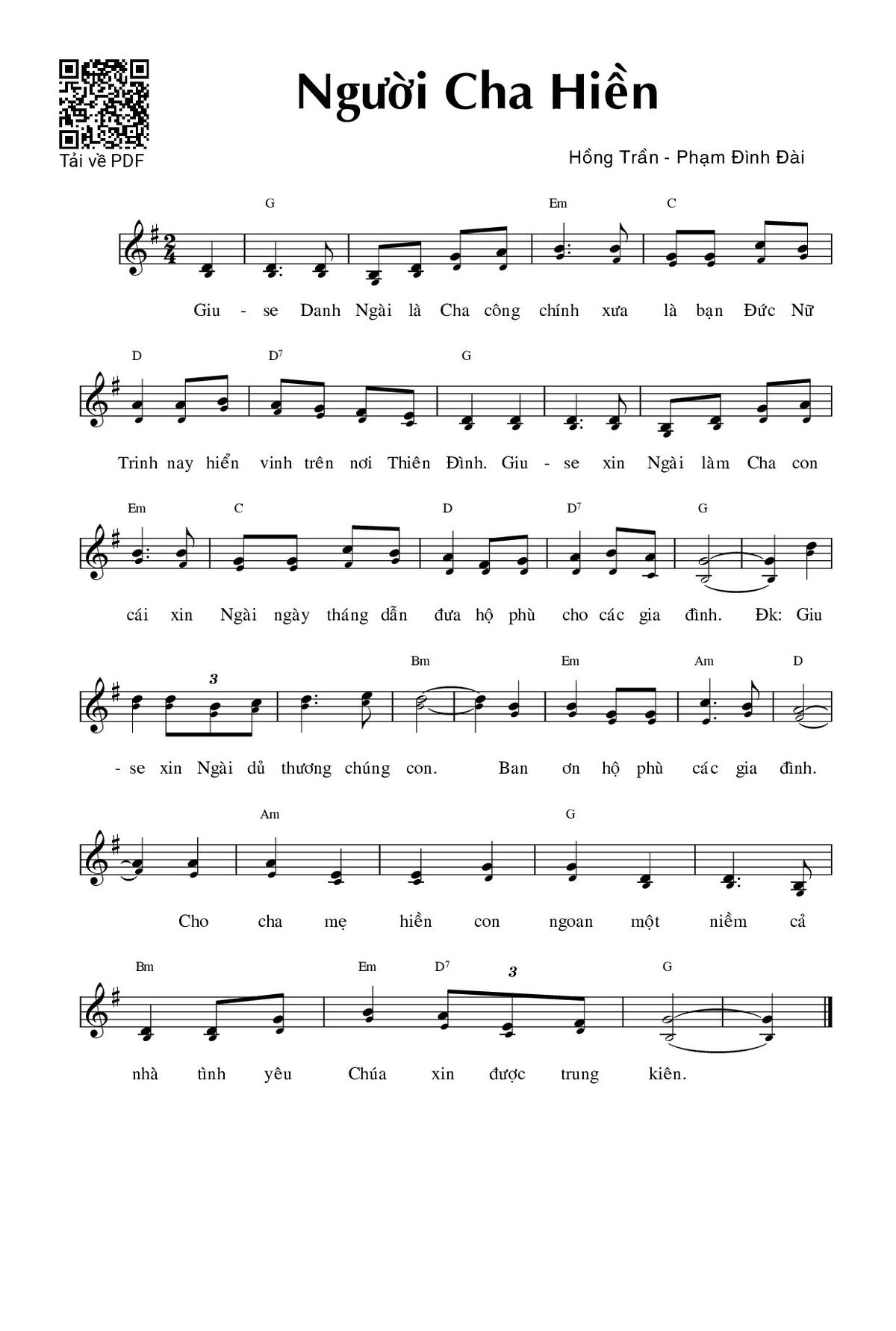 Sheet music Người cha hiền by Phạm Đình Đài and PDF file was posted here to support you to practice singing perfectly. Sheets with notes and chords are for reference only, for non-commercial purposes only, not involved with earning money by buying and selling. Copyright is belong to song writer/author and copyright owner. Truongca.com do not own any copyrighted content. You can download the high-quality PDF files which contain staffs by PDF link above.