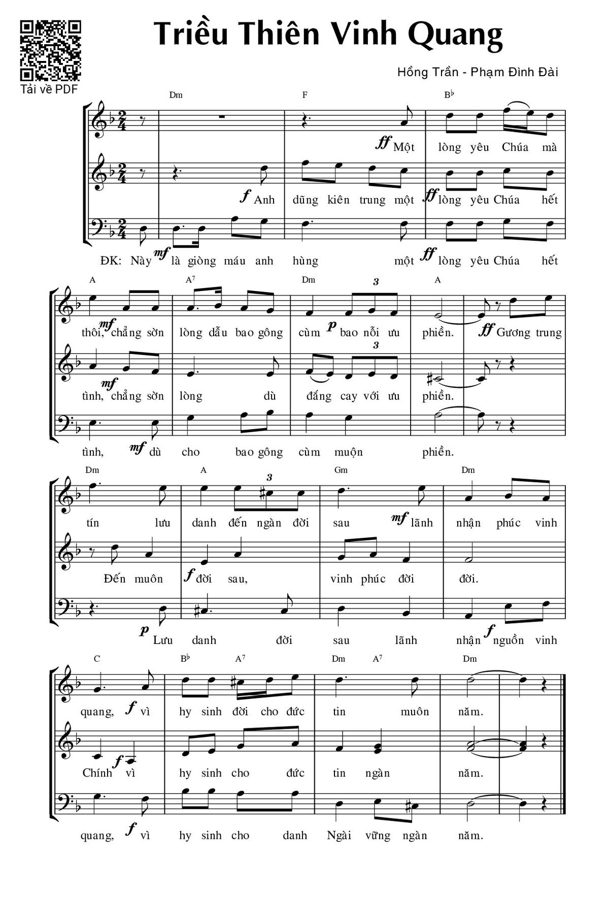 Sheet music Triều thiên vinh quang by Phạm Đình Đài and PDF file was posted here to support you to practice singing perfectly. Sheets with notes and chords are for reference only, for non-commercial purposes only, not involved with earning money by buying and selling. Copyright is belong to song writer/author and copyright owner. Truongca.com do not own any copyrighted content. You can download the high-quality PDF files which contain staffs by PDF link above.