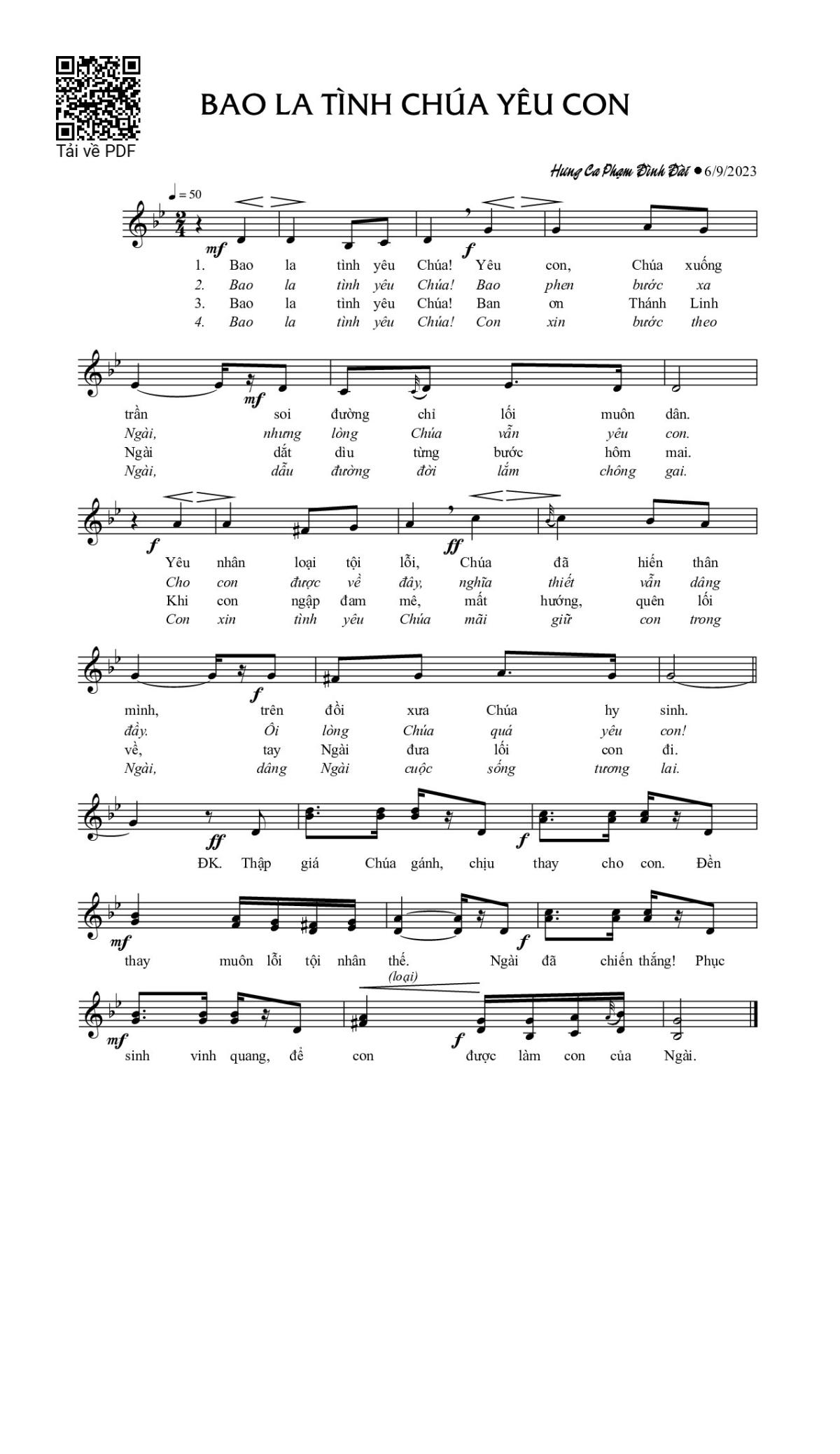 Sheet music Bao là tình Chúa yêu con by Phạm Đình Đài and PDF file was posted here to support you to practice singing perfectly. Sheets with notes and chords are for reference only, for non-commercial purposes only, not involved with earning money by buying and selling. Copyright is belong to song writer/author and copyright owner. Truongca.com do not own any copyrighted content. You can download the high-quality PDF files which contain staffs by PDF link above.