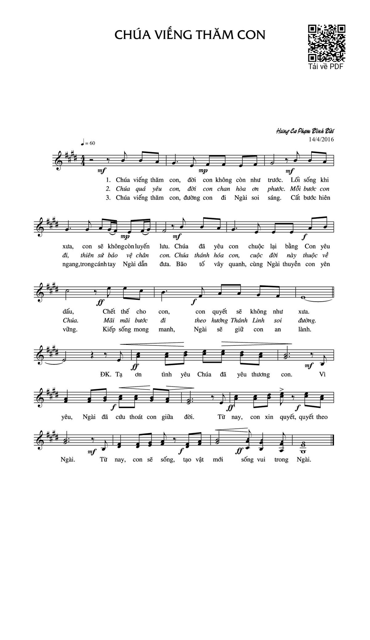 Sheet music Chúa viếng thăm con by Phạm Đình Đài and PDF file was posted here to support you to practice singing perfectly. Sheets with notes and chords are for reference only, for non-commercial purposes only, not involved with earning money by buying and selling. Copyright is belong to song writer/author and copyright owner. Truongca.com do not own any copyrighted content. You can download the high-quality PDF files which contain staffs by PDF link above.