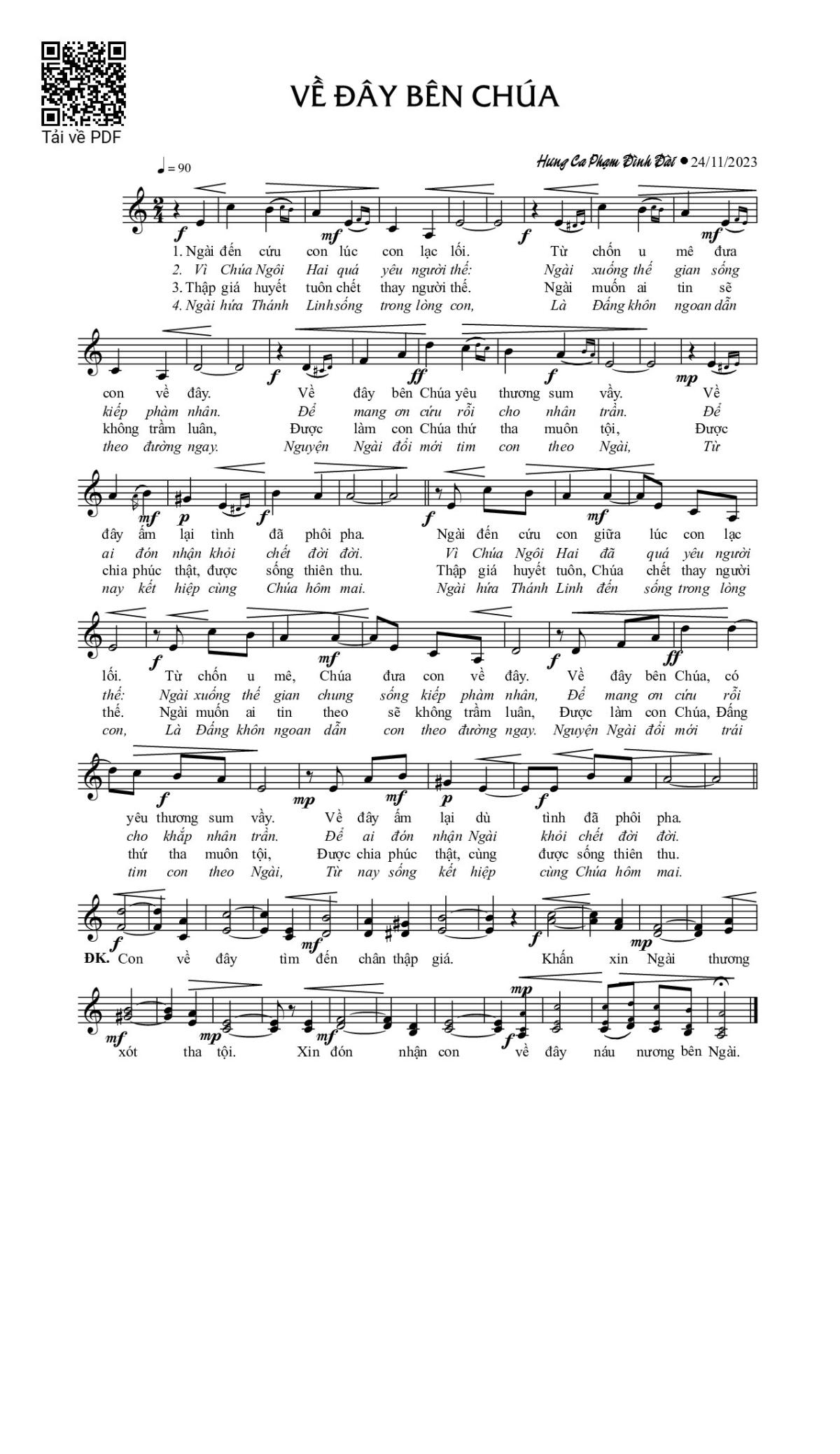 Transposition is the process of moving a song's melody and chords up or down in pitch by a constant interval. The direction of the transposition tool is indicated by a plus (+) sign for up and a minus (-) sign for down. Hover mouse over chords signs to see the chords chart of Về đây bên Chúa song.