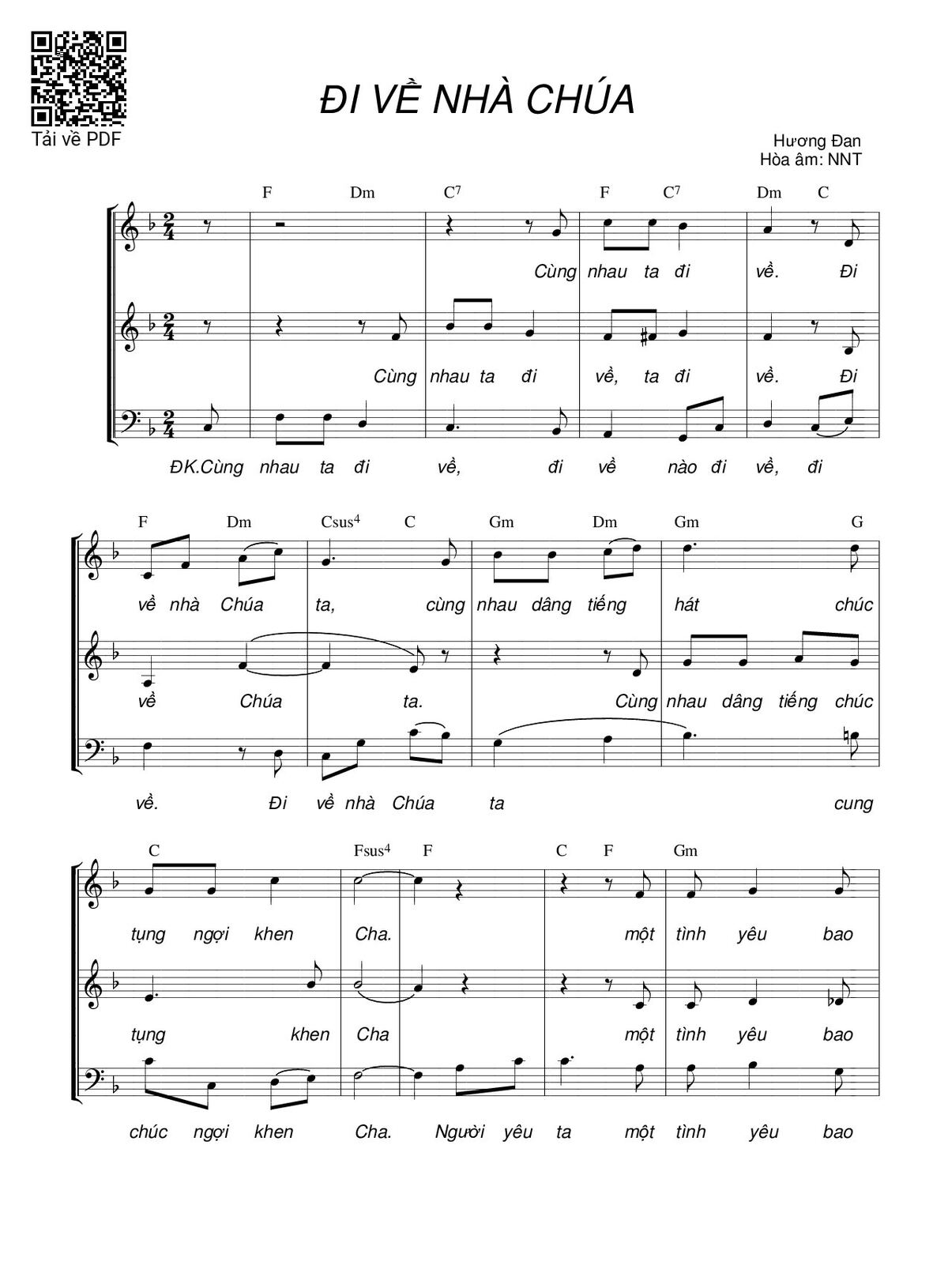 Sheet music Đi về nhà Chúa (3 bè) by Hương Đan and PDF file was posted here to support you to practice singing perfectly. Sheets with notes and chords are for reference only, for non-commercial purposes only, not involved with earning money by buying and selling. Copyright is belong to song writer/author and copyright owner. Truongca.com do not own any copyrighted content. You can download the high-quality PDF files which contain staffs by PDF link above.