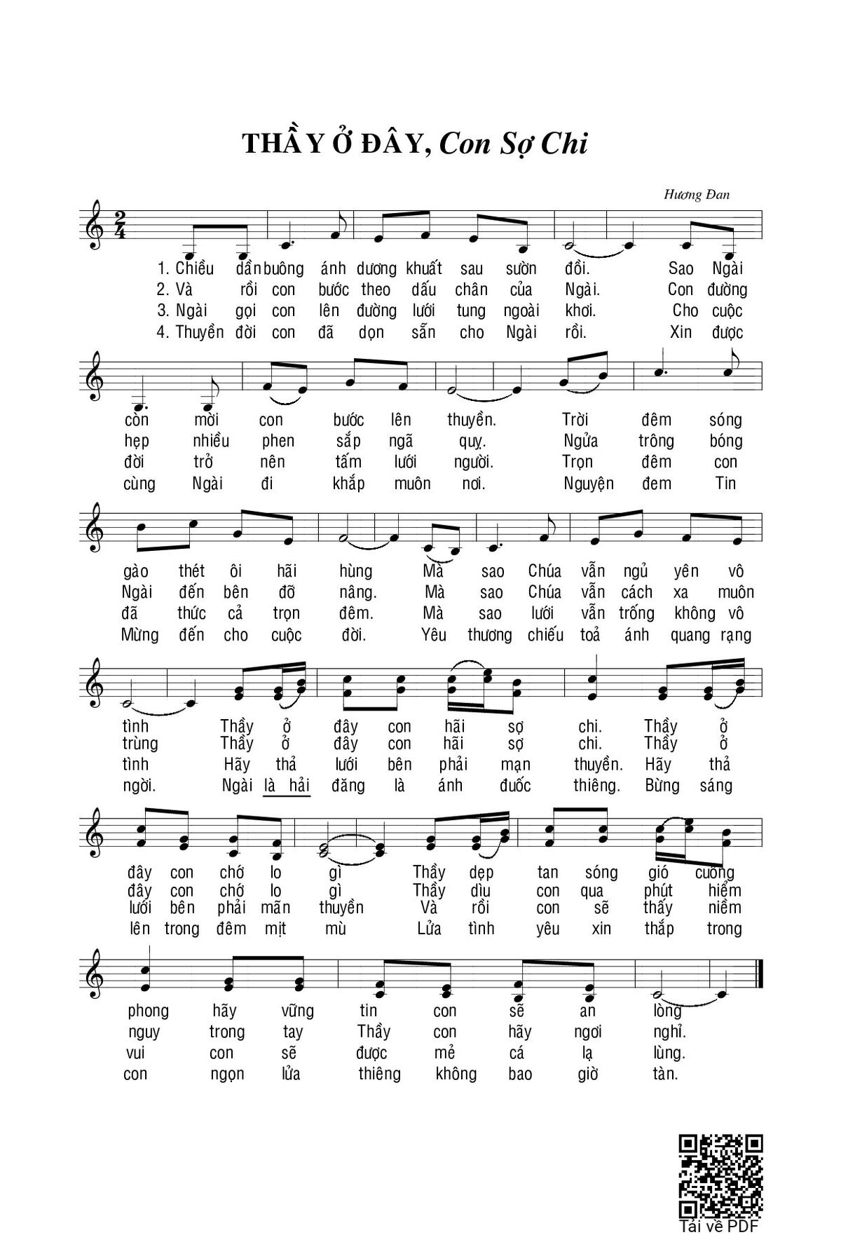 Sheet music Thầy ở đây, con sợ chi by Hương Đan and PDF file was posted here to support you to practice singing perfectly. Sheets with notes and chords are for reference only, for non-commercial purposes only, not involved with earning money by buying and selling. Copyright is belong to song writer/author and copyright owner. Truongca.com do not own any copyrighted content. You can download the high-quality PDF files which contain staffs by PDF link above.