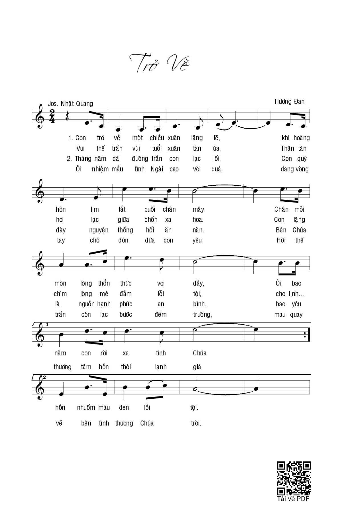 Sheet music Trở về by Hương Đan and PDF file was posted here to support you to practice singing perfectly. Sheets with notes and chords are for reference only, for non-commercial purposes only, not involved with earning money by buying and selling. Copyright is belong to song writer/author and copyright owner. Truongca.com do not own any copyrighted content. You can download the high-quality PDF files which contain staffs by PDF link above.