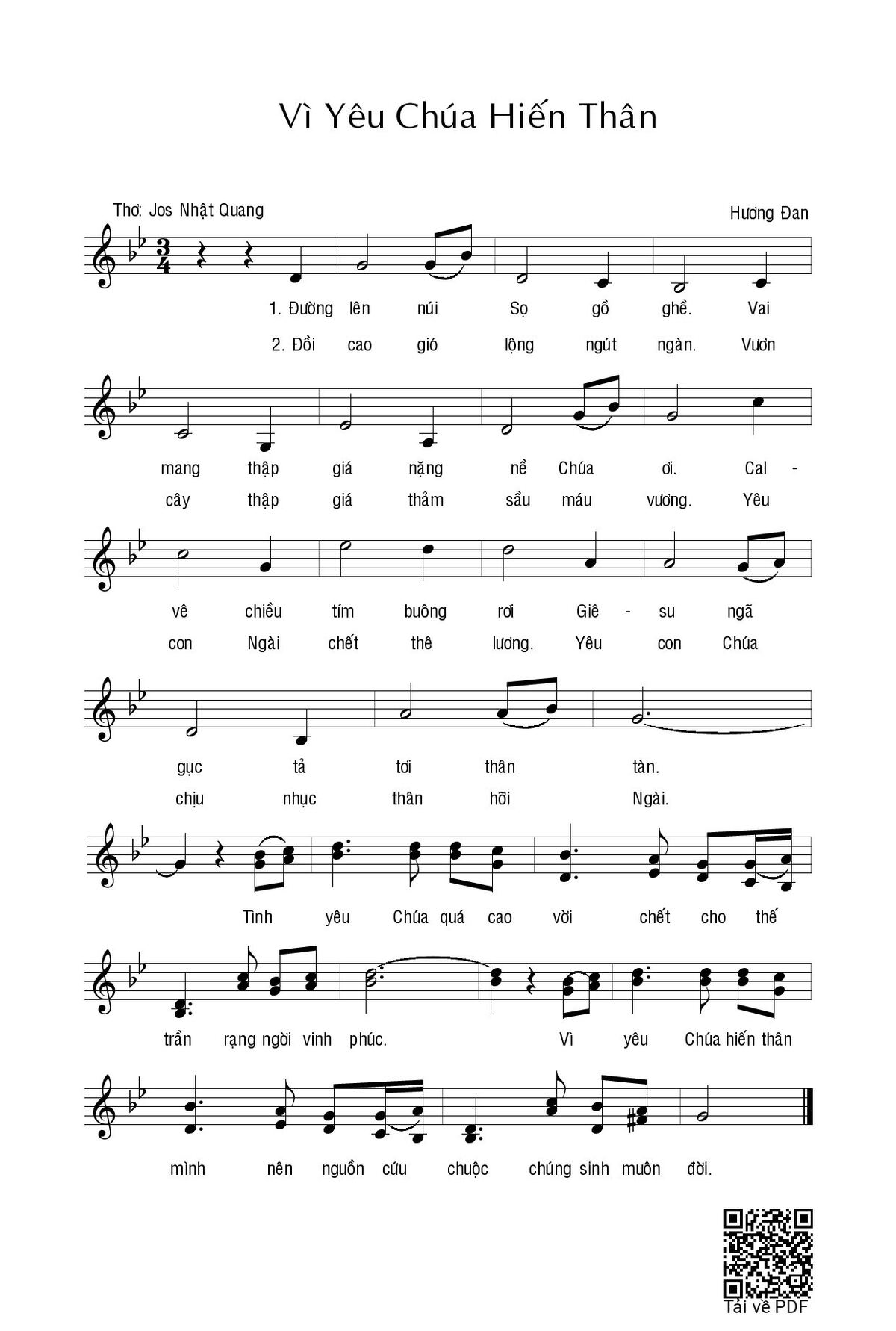 Sheet music Vì yêu Chúa hiến thân by Hương Đan and PDF file was posted here to support you to practice singing perfectly. Sheets with notes and chords are for reference only, for non-commercial purposes only, not involved with earning money by buying and selling. Copyright is belong to song writer/author and copyright owner. Truongca.com do not own any copyrighted content. You can download the high-quality PDF files which contain staffs by PDF link above.