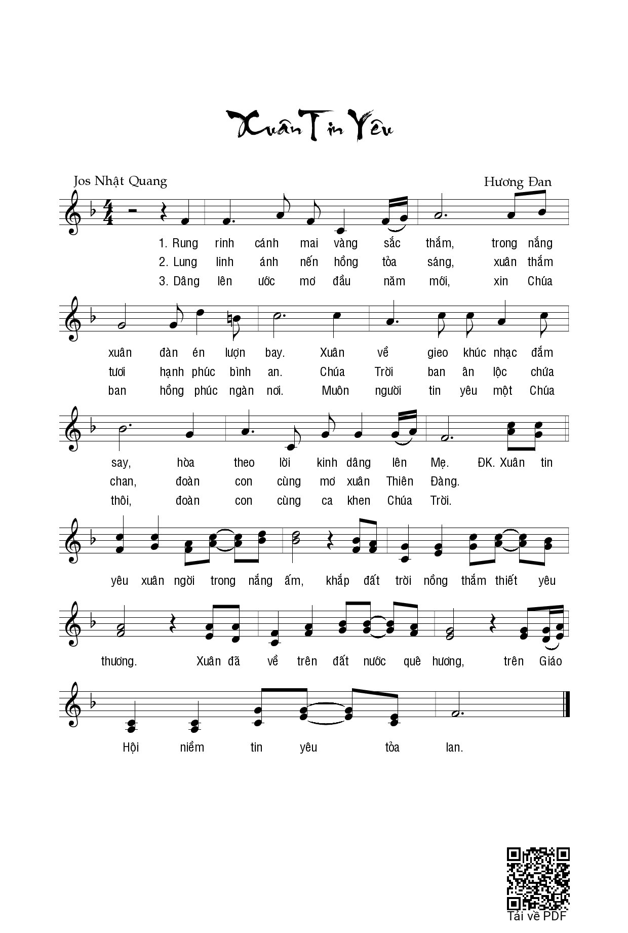 Sheet music Xuân tin yêu by Hương Đan and PDF file was posted here to support you to practice singing perfectly. Sheets with notes and chords are for reference only, for non-commercial purposes only, not involved with earning money by buying and selling. Copyright is belong to song writer/author and copyright owner. Truongca.com do not own any copyrighted content. You can download the high-quality PDF files which contain staffs by PDF link above.