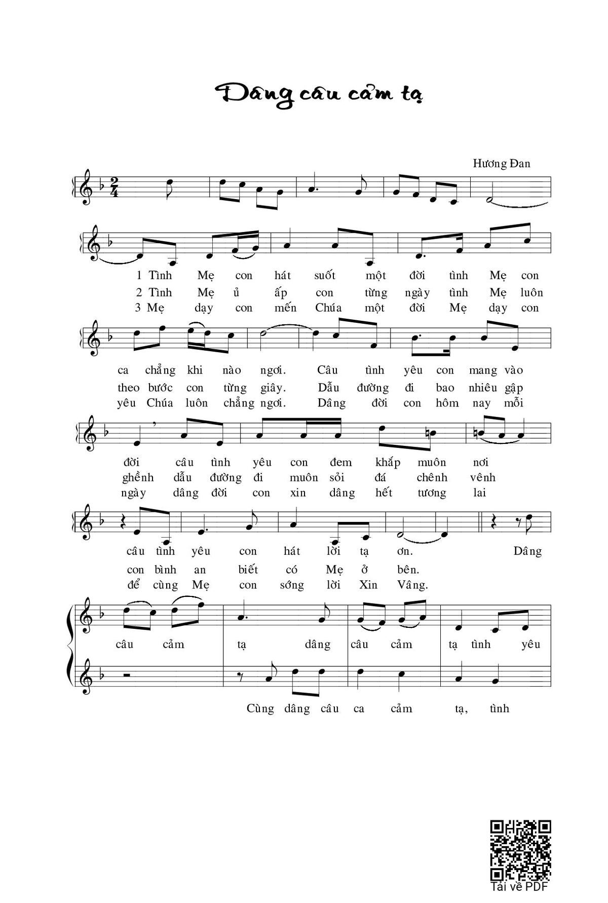 Sheet music Dâng câu cảm tạ by Hương Đan and PDF file was posted here to support you to practice singing perfectly. Sheets with notes and chords are for reference only, for non-commercial purposes only, not involved with earning money by buying and selling. Copyright is belong to song writer/author and copyright owner. Truongca.com do not own any copyrighted content. You can download the high-quality PDF files which contain staffs by PDF link above.