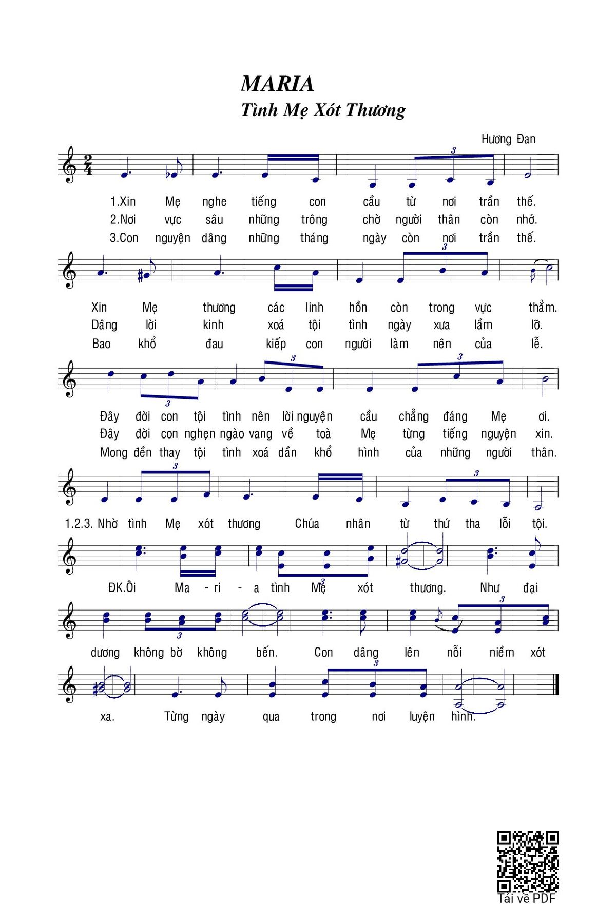 Sheet music Maria tình Mẹ xót thương by Hương Đan and PDF file was posted here to support you to practice singing perfectly. Sheets with notes and chords are for reference only, for non-commercial purposes only, not involved with earning money by buying and selling. Copyright is belong to song writer/author and copyright owner. Truongca.com do not own any copyrighted content. You can download the high-quality PDF files which contain staffs by PDF link above.