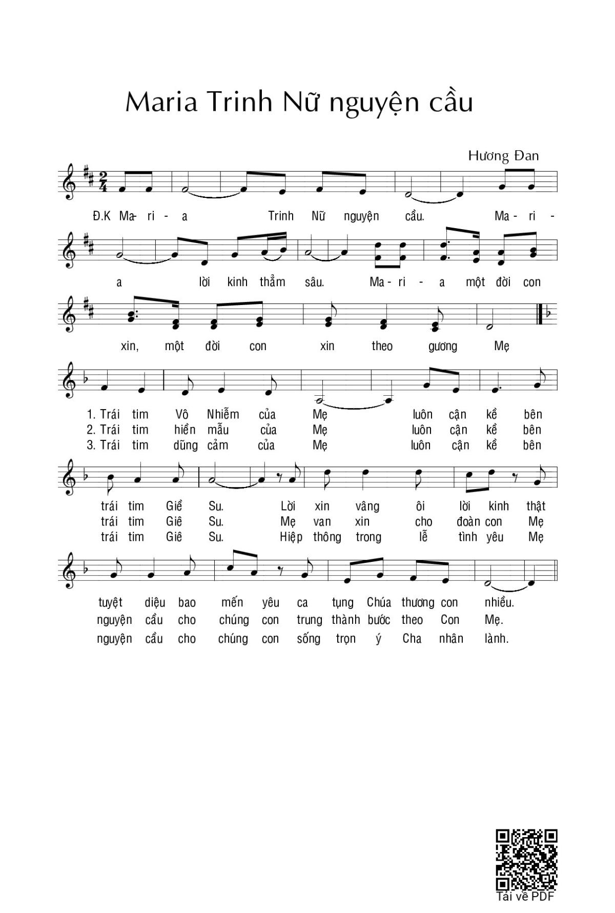 Sheet music Maria Trinh nữ nguyện cầu by Hương Đan and PDF file was posted here to support you to practice singing perfectly. Sheets with notes and chords are for reference only, for non-commercial purposes only, not involved with earning money by buying and selling. Copyright is belong to song writer/author and copyright owner. Truongca.com do not own any copyrighted content. You can download the high-quality PDF files which contain staffs by PDF link above.