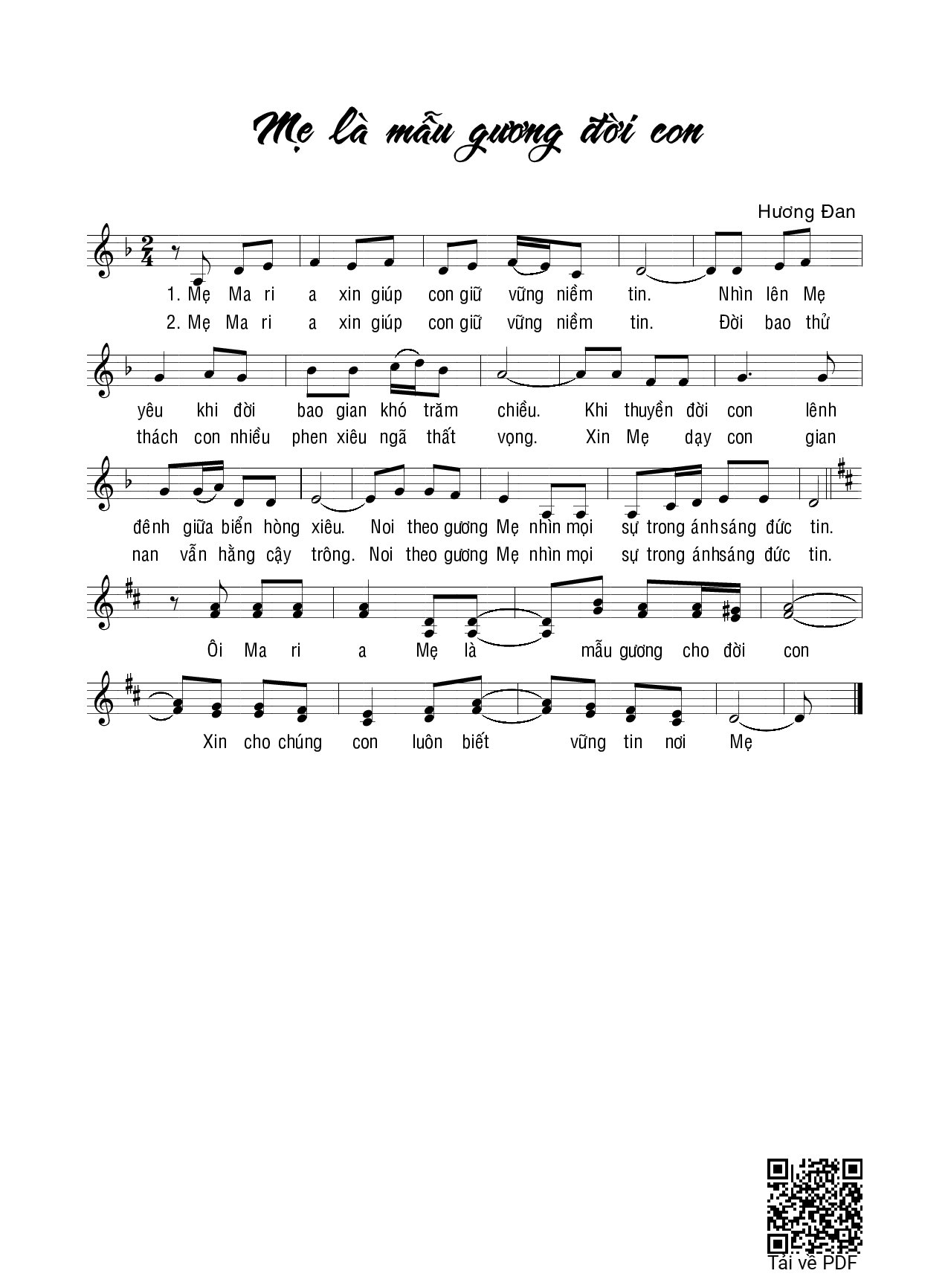 Sheet music Mẹ là mẫu gương đời con by Hương Đan and PDF file was posted here to support you to practice singing perfectly. Sheets with notes and chords are for reference only, for non-commercial purposes only, not involved with earning money by buying and selling. Copyright is belong to song writer/author and copyright owner. Truongca.com do not own any copyrighted content. You can download the high-quality PDF files which contain staffs by PDF link above.