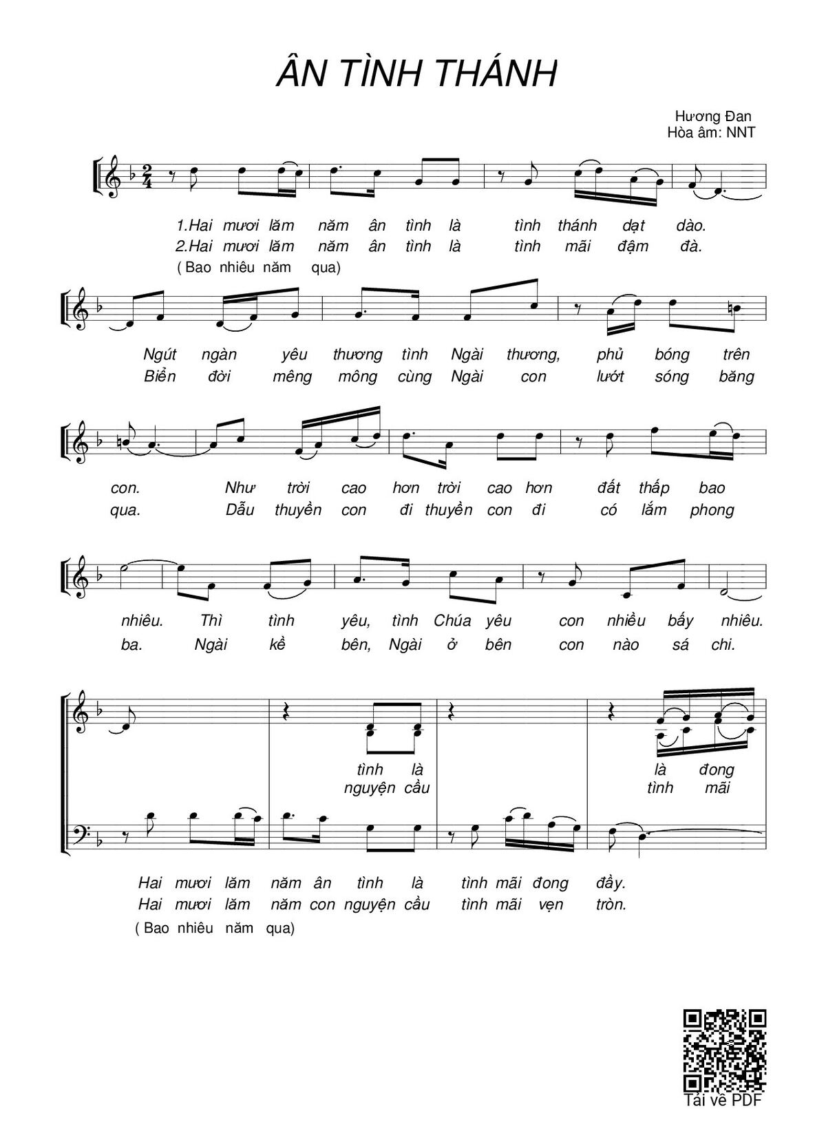 Sheet music Ân tình thánh (3 bè) by Hương Đan and PDF file was posted here to support you to practice singing perfectly. Sheets with notes and chords are for reference only, for non-commercial purposes only, not involved with earning money by buying and selling. Copyright is belong to song writer/author and copyright owner. Truongca.com do not own any copyrighted content. You can download the high-quality PDF files which contain staffs by PDF link above.