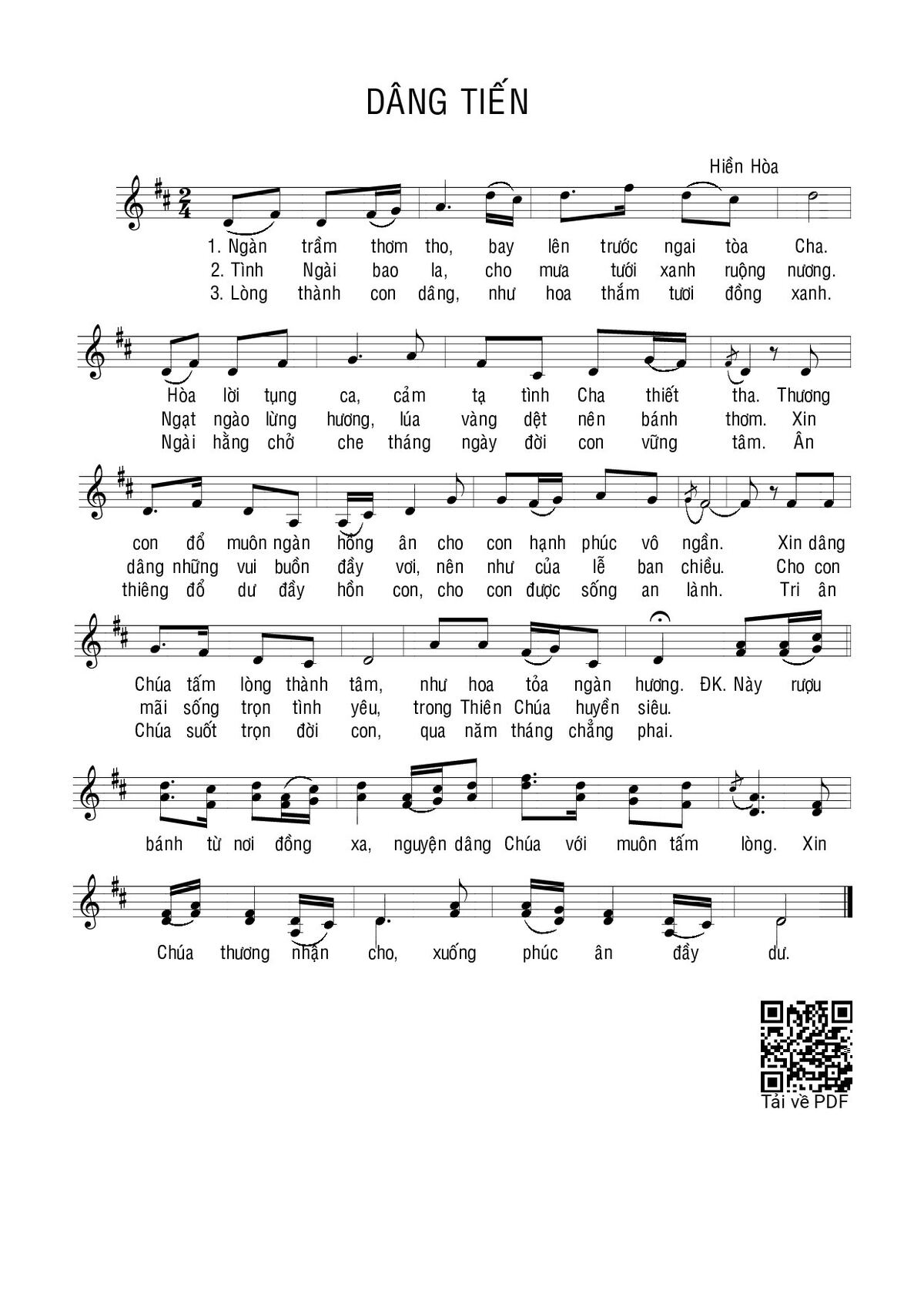 Sheet music Dâng tiến by Hiền Hòa and PDF file was posted here to support you to practice singing perfectly. Sheets with notes and chords are for reference only, for non-commercial purposes only, not involved with earning money by buying and selling. Copyright is belong to song writer/author and copyright owner. Truongca.com do not own any copyrighted content. You can download the high-quality PDF files which contain staffs by PDF link above.
